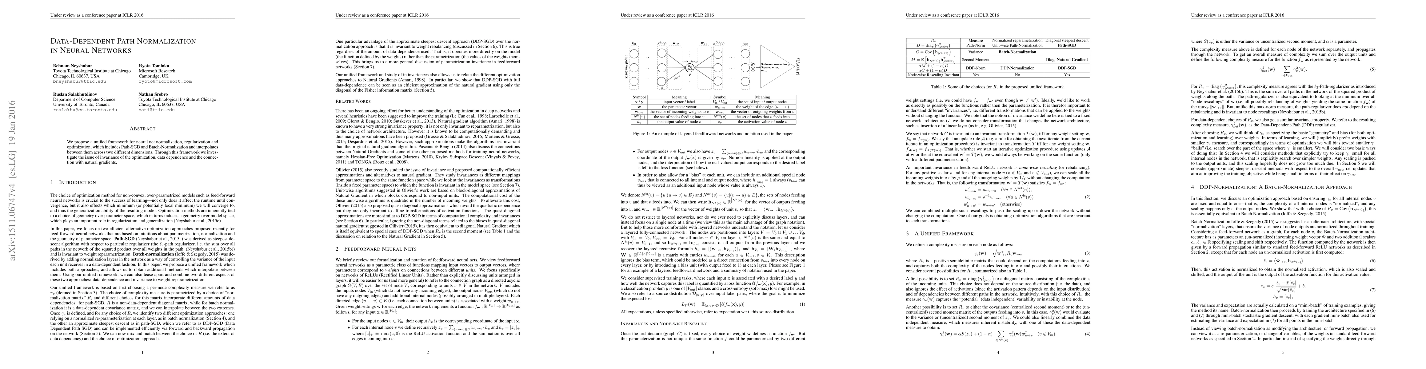 We propose a unified framework for neural net normalization, regularization and optimization, which includes Path-SGD and Batch-Normalization and interpolates between them across two different dimensions. Through this framework we investigate issue of invariance of the optimization, data dependence and the connection with natural gradients.
