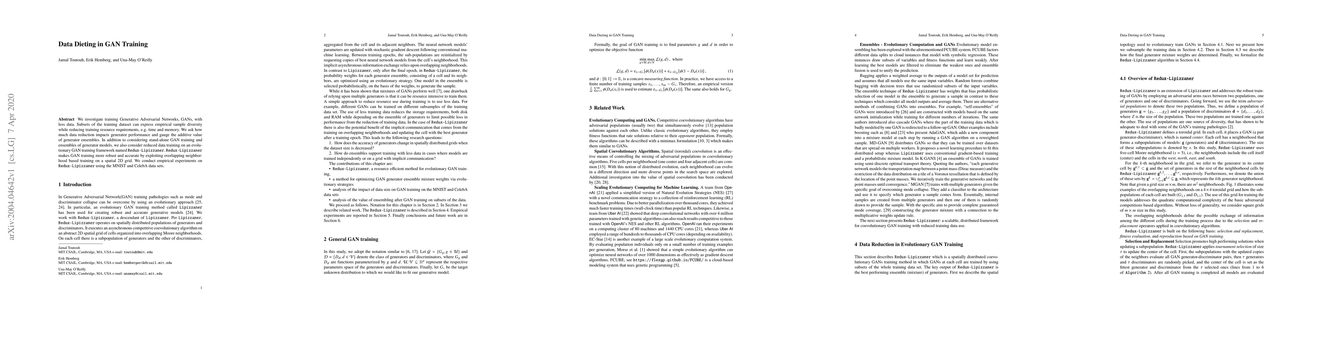 We investigate training Generative Adversarial Networks, GANs, with less data. Subsets of the training dataset can express empirical sample diversity while reducing training resource requirements, e.g. time and memory. We ask how much data reduction impacts generator performance and gauge the additive value of generator ensembles. In addition to considering stand-alone GAN training and ensembles of generator models, we also consider reduced data training on an evolutionary GAN training framework named Redux-Lipizzaner. Redux-Lipizzaner makes GAN training more robust and accurate by exploiting overlapping neighborhood-based training on a spatial 2D grid. We conduct empirical experiments on Redux-Lipizzaner using the MNIST and CelebA data sets.