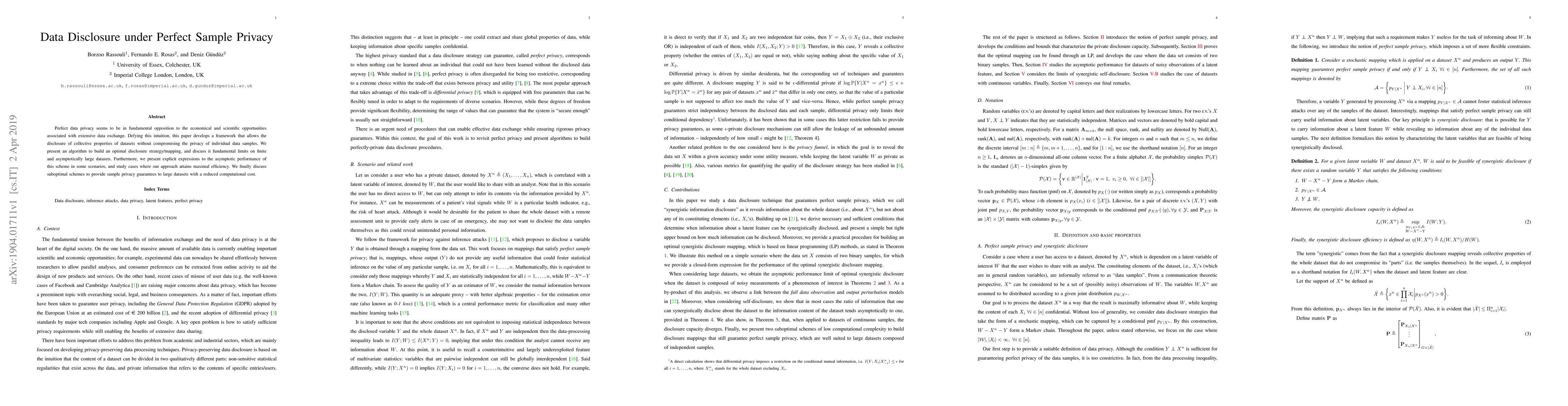 Perfect data privacy seems to be in fundamental opposition to the economical and scientific opportunities associated with extensive data exchange. Defying this intuition, this paper develops a framework that allows the disclosure of collective properties of datasets without compromising the privacy of individual data samples. We present an algorithm to build an optimal disclosure strategy/mapping, and discuss it fundamental limits on finite and asymptotically large datasets. Furthermore, we present explicit expressions to the asymptotic performance of this scheme in some scenarios, and study cases where our approach attains maximal efficiency. We finally discuss suboptimal schemes to provide sample privacy guarantees to large datasets with a reduced computational cost.