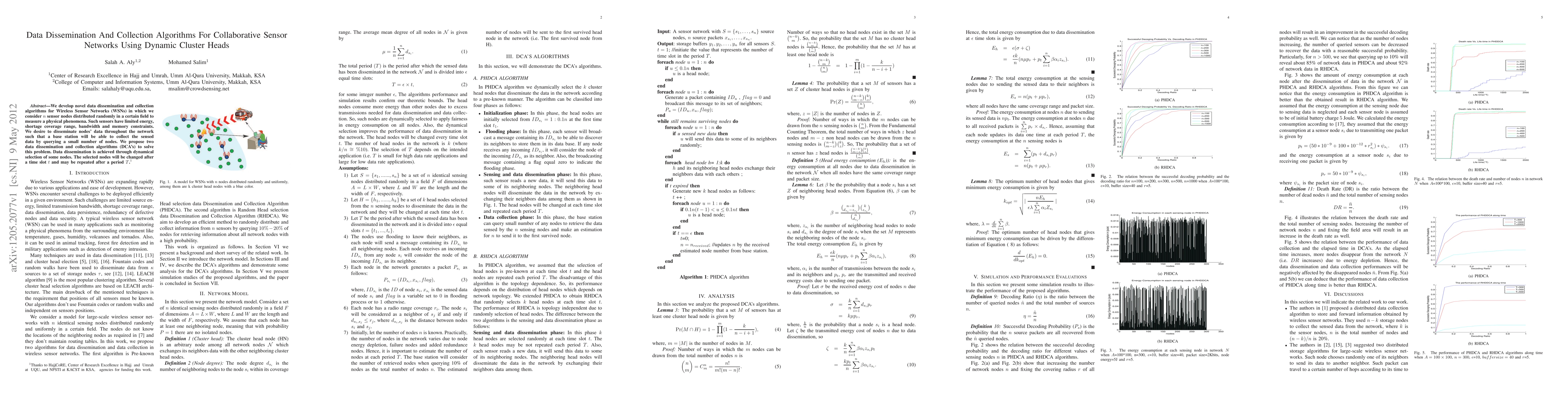 This paper proposes two dynamic cluster head algorithms for Wireless Sensor Networks to efficiently disseminate and collect data. The algorithms aim to optimize energy use, coverage, and bandwidth by dynamically selecting nodes to relay data, with periodic changes to these nodes to ensure network balance.