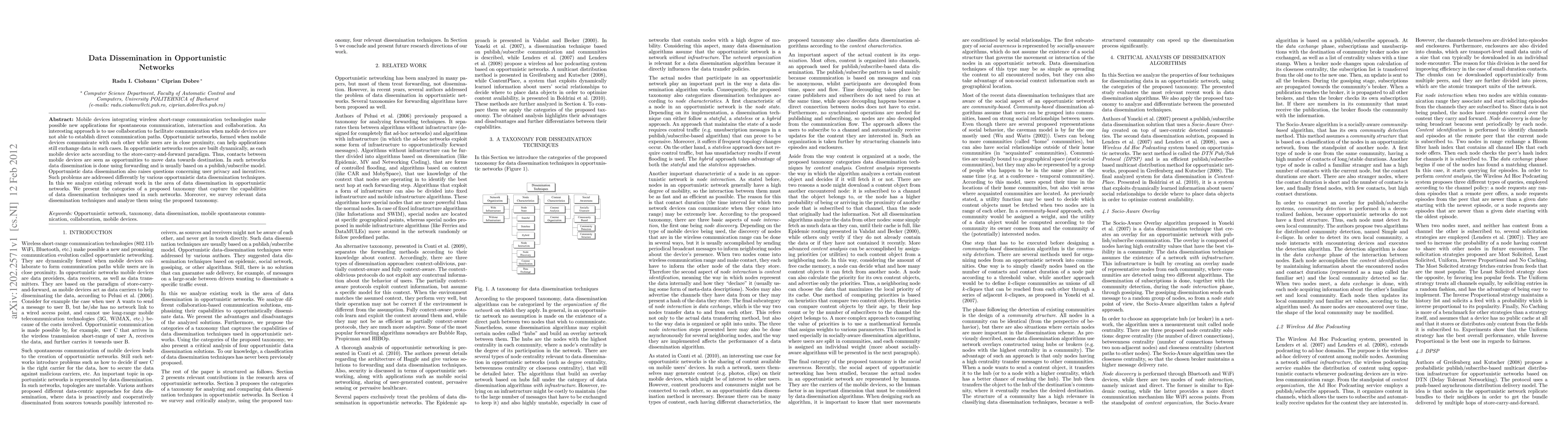 This paper analyzes data dissemination in opportunistic networks, where mobile devices use the store-carry-and-forward paradigm to exchange data when direct paths are unavailable. It proposes a taxonomy to categorize and evaluate various data dissemination techniques, addressing issues like user privacy and incentives.