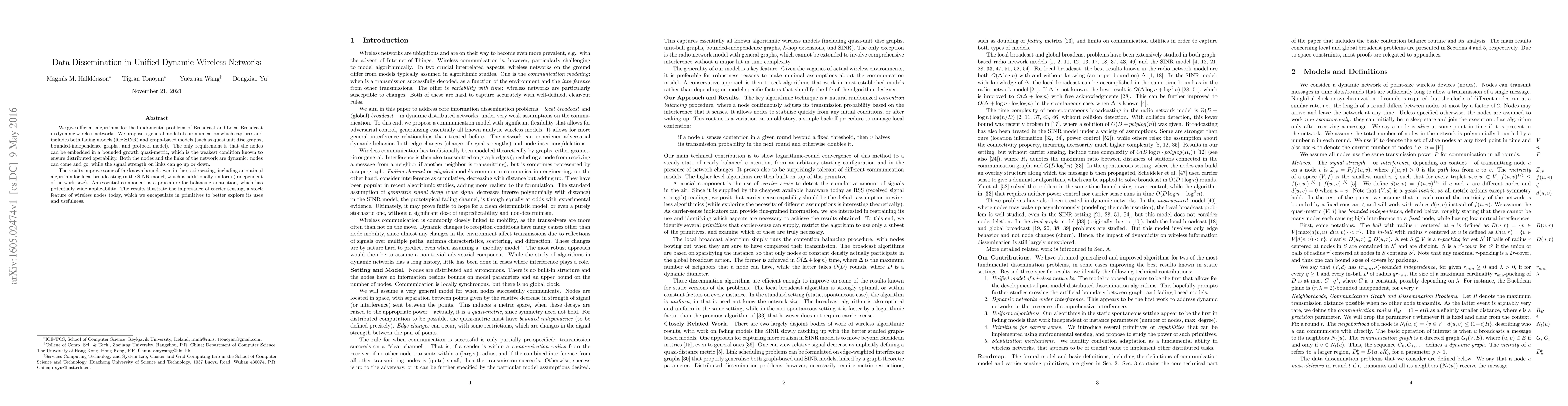Researchers developed efficient algorithms for broadcasting in dynamic wireless networks, improving known bounds and exploring the importance of carrier sensing. Their work provides a general model that captures various fading models and graph-based models, enabling better dissemination of data in changing network conditions.