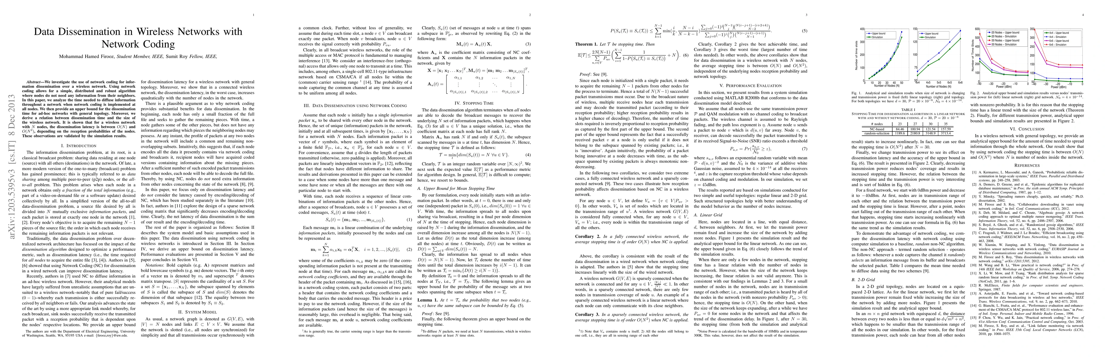 This paper explores network coding for efficient information dissemination in wireless networks, demonstrating that it enables a simple, distributed, and robust algorithm. The study provides an upper bound for dissemination time in ad-hoc networks and shows that latency ranges between O(N) and O(N^2) based on node reception probabilities, validated by simulation results.