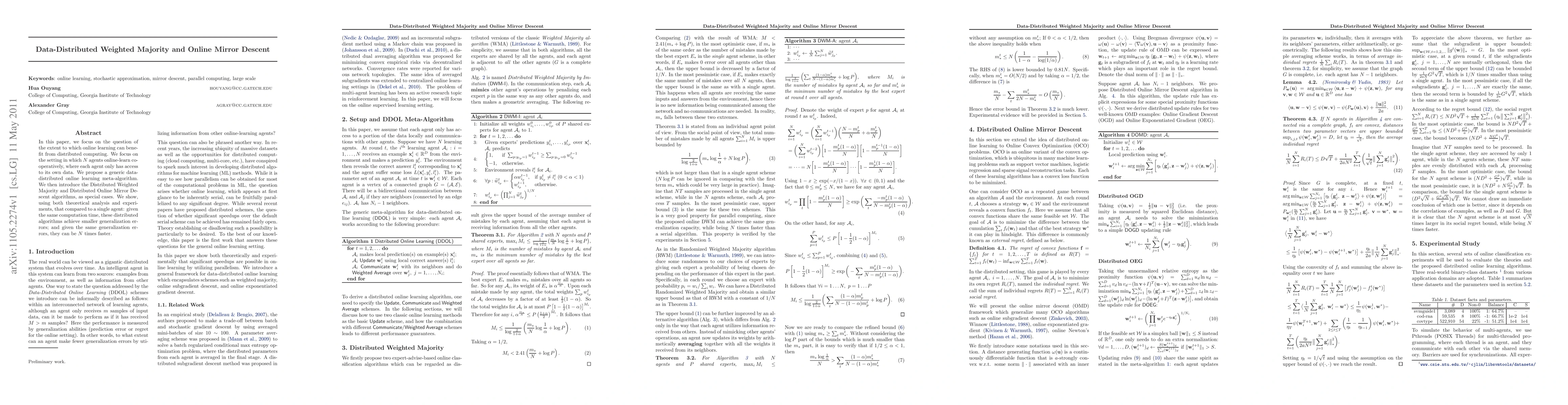 This paper proposes a meta-algorithm for data-distributed online learning where $N$ agents cooperatively learn from their own data, introducing Distributed Weighted Majority and Distributed Online Mirror Descent algorithms. Theoretical and experimental results show that these distributed approaches achieve smaller generalization errors in the same computation time and are $N$ times faster for the same error levels compared to a single agent.
