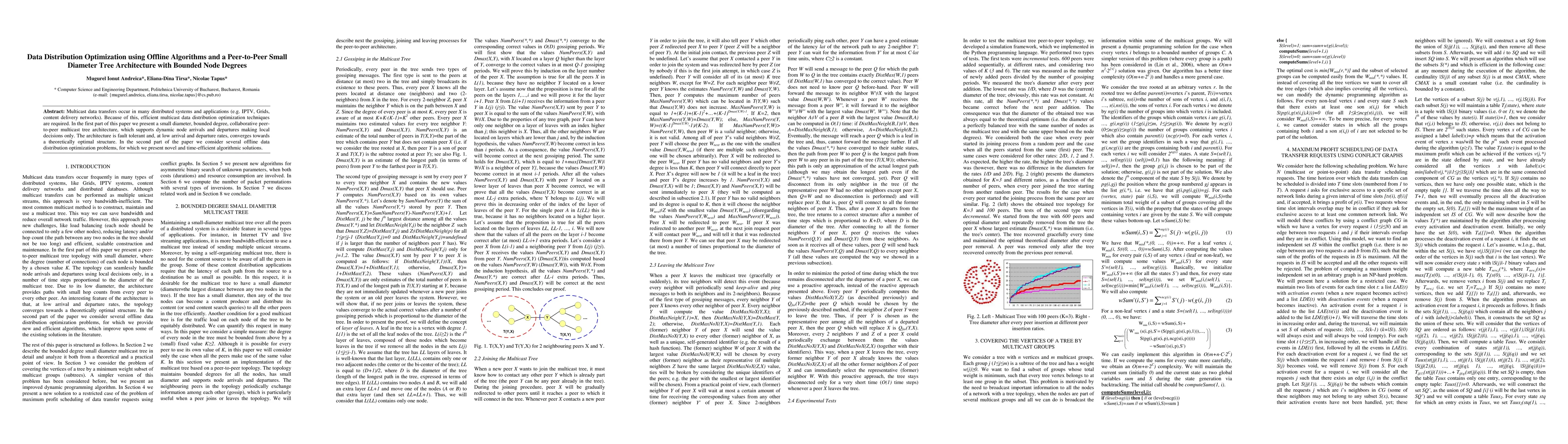 This paper introduces a peer-to-peer multicast tree architecture with bounded node degrees that supports dynamic changes and converges to an optimal structure under low rates of node arrivals and departures. It also proposes novel offline algorithms for optimizing data distribution in multicast scenarios.