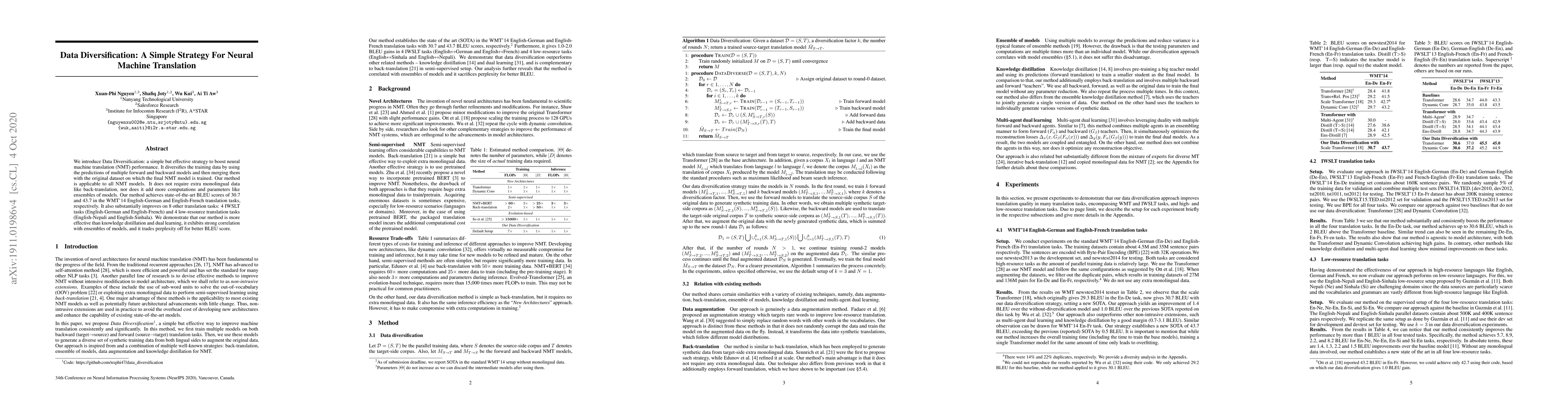 This paper proposes Data Diversification, a straightforward strategy to enhance neural machine translation (NMT) performance by merging predictions from multiple forward and backward models into the training dataset, achieving state-of-the-art BLEU scores in several translation tasks without additional data or computational overhead.