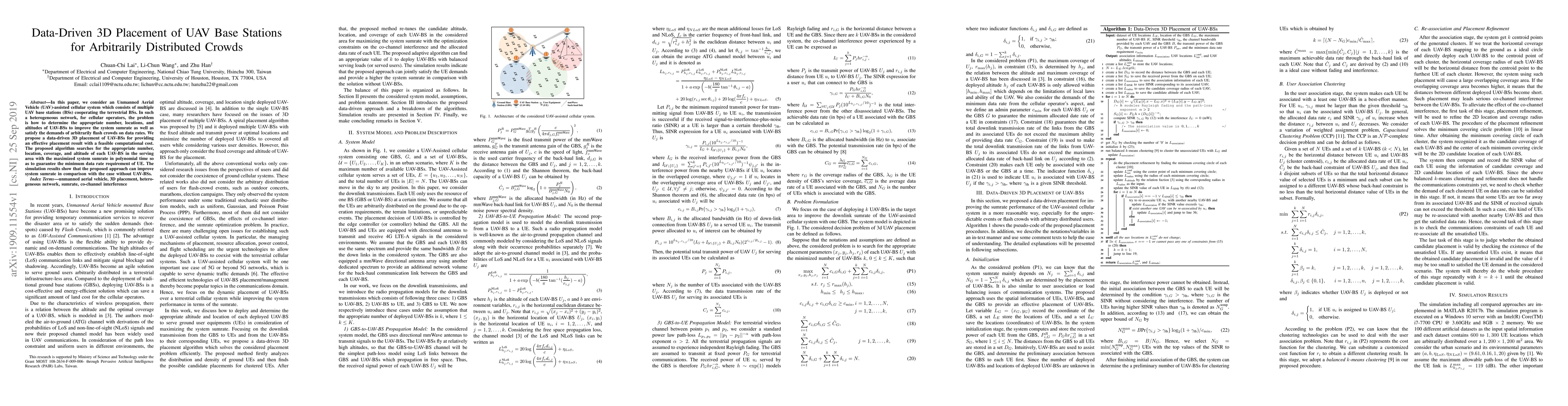 In this paper, we consider an Unmanned Aerial Vehicle (UAV)-assisted cellular system which consists of multiple UAV base stations (BSs) cooperating the terrestrial BSs. In such a heterogeneous network, for cellular operators, the problem is how to determine the appropriate number, locations, and altitudes of UAV-BSs to improve the system sumrate as well as satisfy the demands of arbitrarily flash crowds on data rates. We propose a data-driven 3D placement of UAV-BSs for providing an effective placement result with a feasible computational cost. The proposed algorithm searches for the appropriate number, location, coverage, and altitude of each UAV-BS in the serving area with the maximized system sumrate in polynomial time so as to guarantee the minimum data rate requirement of UE. The simulation results show that the proposed approach can improve system sumrate in comparison with the case without UAV-BSs.