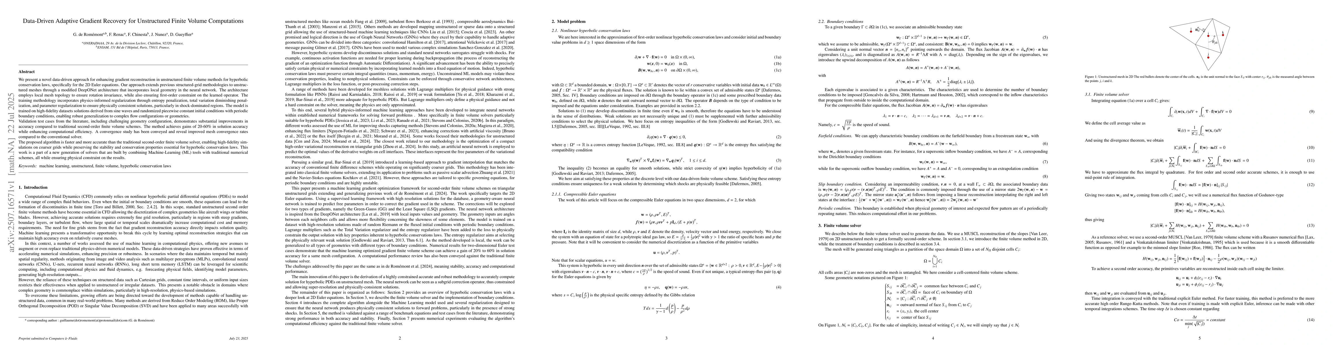 We present a novel data-driven approach for enhancing gradient reconstruction in unstructured finite volume methods for hyperbolic conservation laws, specifically for the 2D Euler equations. Our approach extends previous structured-grid methodologies to unstructured meshes through a modified DeepONet architecture that incorporates local geometry in the neural network. The architecture employs local mesh topology to ensure rotation invariance, while also ensuring first-order constraint on the learned operator. The training methodology incorporates physics-informed regularization through entropy penalization, total variation diminishing penalization, and parameter regularization to ensure physically consistent solutions, particularly in shock-dominated regions. The model is trained on high-fidelity datasets solutions derived from sine waves and randomized piecewise constant initial conditions with periodic boundary conditions, enabling robust generalization to complex flow configurations or geometries. Validation test cases from the literature, including challenging geometry configuration, demonstrates substantial improvements in accuracy compared to traditional second-order finite volume schemes. The method achieves gains of 20-60% in solution accuracy while enhancing computational efficiency. A convergence study has been conveyed and reveal improved mesh convergence rates compared to the conventional solver. The proposed algorithm is faster and more accurate than the traditional second-order finite volume solver, enabling high-fidelity simulations on coarser grids while preserving the stability and conservation properties essential for hyperbolic conservation laws. This work is a part of a new generation of solvers that are built by combining Machine-Learning (ML) tools with traditional numerical schemes, all while ensuring physical constraint on the results.
