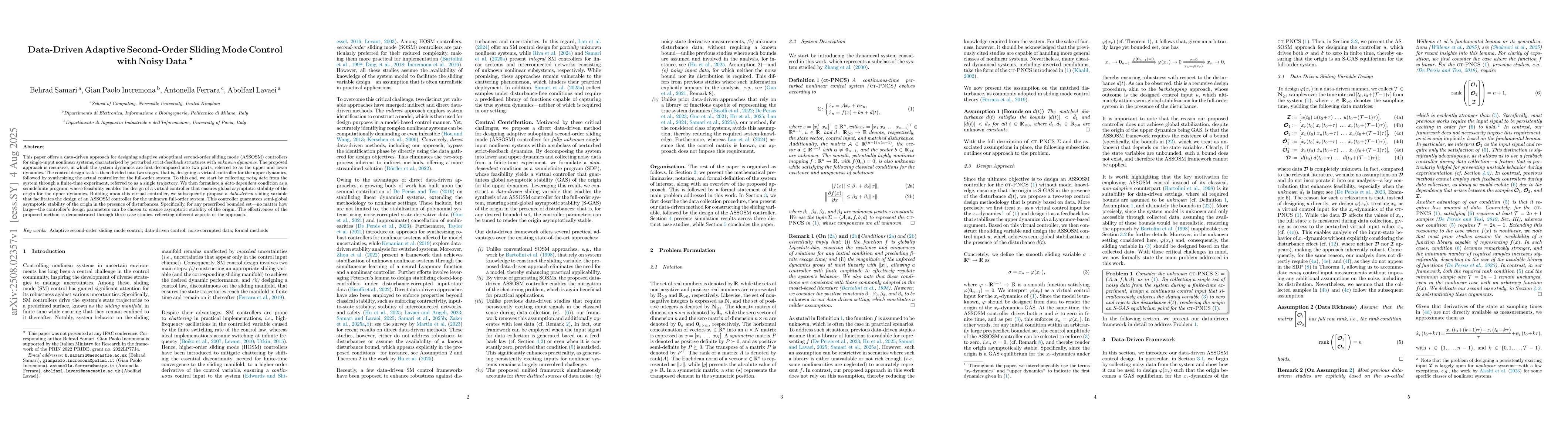 The paper presents a novel data-driven design method for adaptive second-order sliding mode controllers, utilizing a recursive approach and leveraging noisy data collected from a finite-time experiment to ensure stability and performance guarantees.