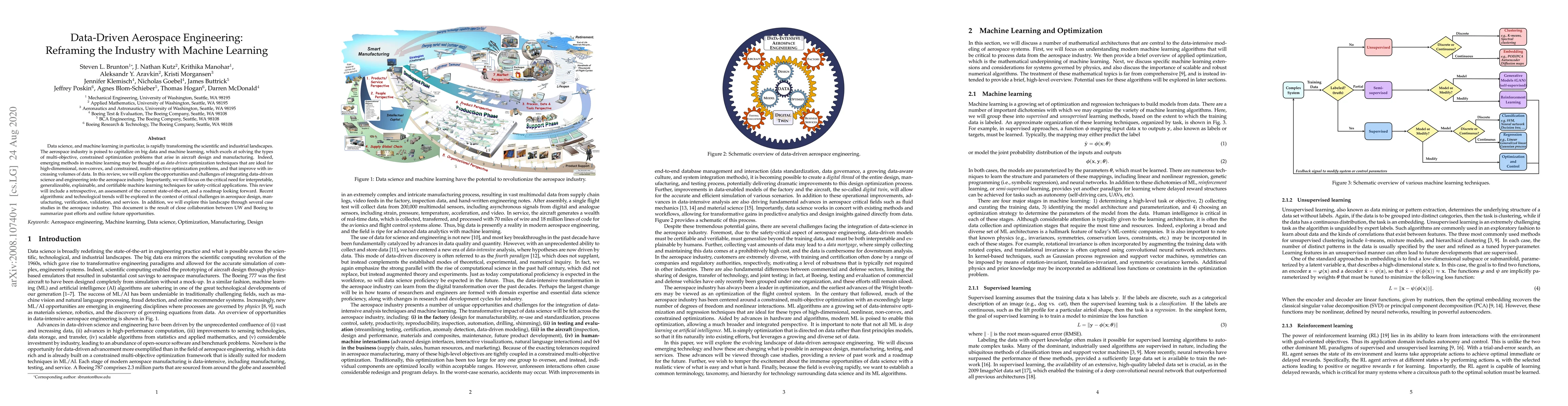 This paper reviews the transformative potential of machine learning in aerospace engineering, emphasizing its role in solving complex optimization problems in aircraft design and manufacturing. It highlights the need for interpretable and certifiable machine learning techniques for safety-critical applications, and provides a roadmap for future integration of data-driven methods in aerospace design, manufacturing, and services.