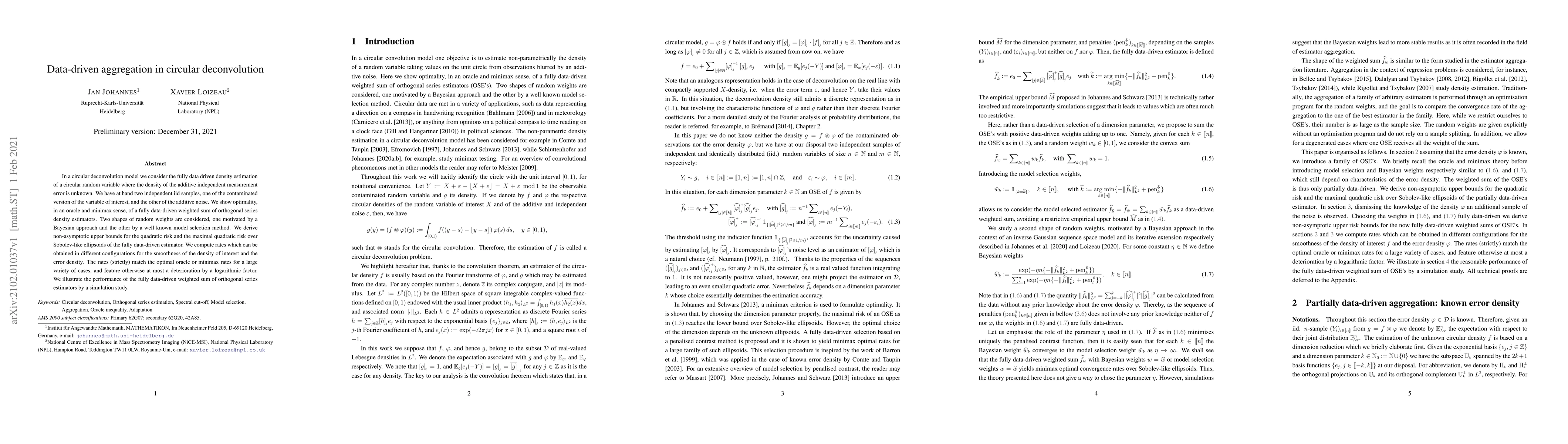 In a circular deconvolution model we consider the fully data driven density estimation of a circular random variable where the density of the additive independent measurement error is unknown. We have at hand two independent iid samples, one of the contaminated version of the variable of interest, and the other of the additive noise. We show optimality,in an oracle and minimax sense, of a fully data-driven weighted sum of orthogonal series density estimators. Two shapes of random weights are considered, one motivated by a Bayesian approach and the other by a well known model selection method. We derive non-asymptotic upper bounds for the quadratic risk and the maximal quadratic risk over Sobolev-like ellipsoids of the fully data-driven estimator. We compute rates which can be obtained in different configurations for the smoothness of the density of interest and the error density. The rates (strictly) match the optimal oracle or minimax rates for a large variety of cases, and feature otherwise at most a deterioration by a logarithmic factor. We illustrate the performance of the fully data-driven weighted sum of orthogonal series estimators by a simulation study.