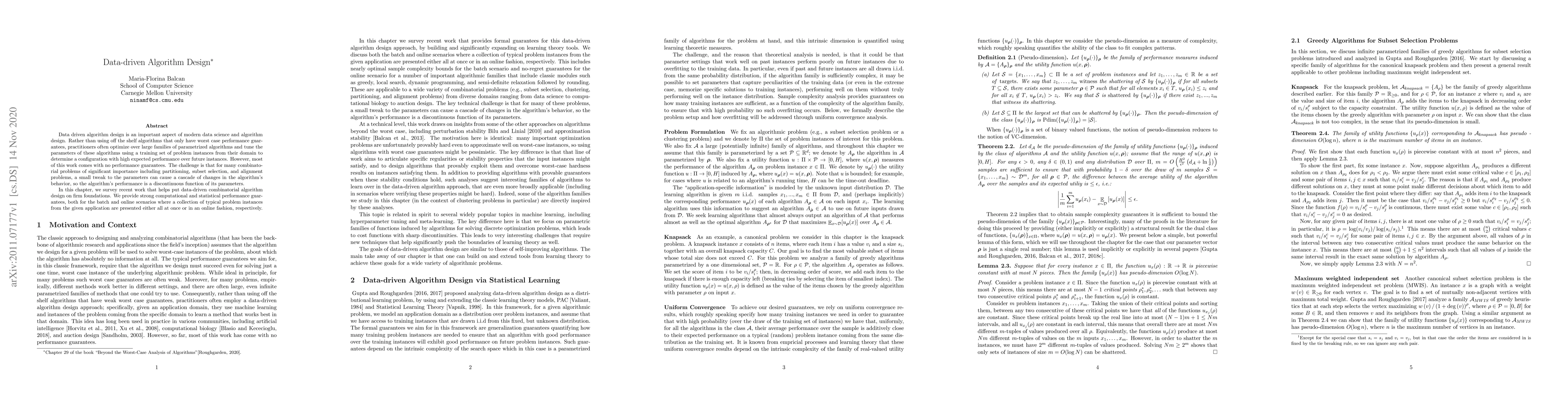 Data driven algorithm design is an important aspect of modern data science and algorithm design. Rather than using off the shelf algorithms that only have worst case performance guarantees, practitioners often optimize over large families of parametrized algorithms and tune the parameters of these algorithms using a training set of problem instances from their domain to determine a configuration with high expected performance over future instances. However, most of this work comes with no performance guarantees. The challenge is that for many combinatorial problems of significant importance including partitioning, subset selection, and alignment problems, a small tweak to the parameters can cause a cascade of changes in the algorithm's behavior, so the algorithm's performance is a discontinuous function of its parameters. In this chapter, we survey recent work that helps put data-driven combinatorial algorithm design on firm foundations. We provide strong computational and statistical performance guarantees, both for the batch and online scenarios where a collection of typical problem instances from the given application are presented either all at once or in an online fashion, respectively.