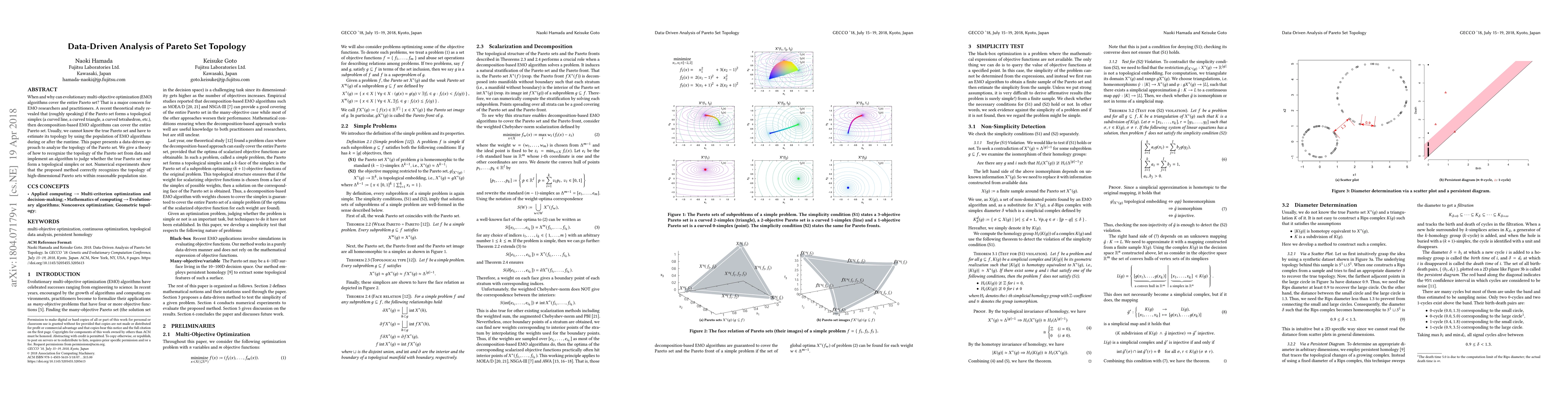 This paper proposes a data-driven method to analyze the topology of the Pareto set, determining if it forms a topological simplex, which allows decomposition-based evolutionary multi-objective optimization algorithms to cover the entire set. The method accurately recognizes the topology from algorithm population data, validated through numerical experiments.
