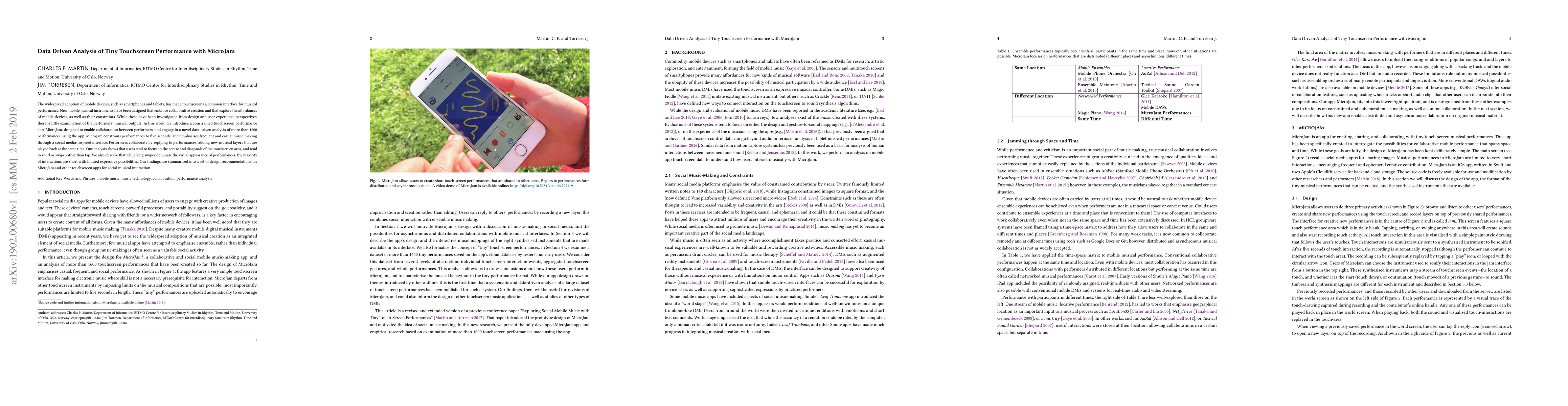 This paper analyzes over 1600 performances using MicroJam, a touchscreen app designed for collaborative, short-duration musical interactions. The study reveals that users predominantly engage with the central and diagonal areas of the screen, favoring swipes over taps, despite long swipes visually dominating the performances.