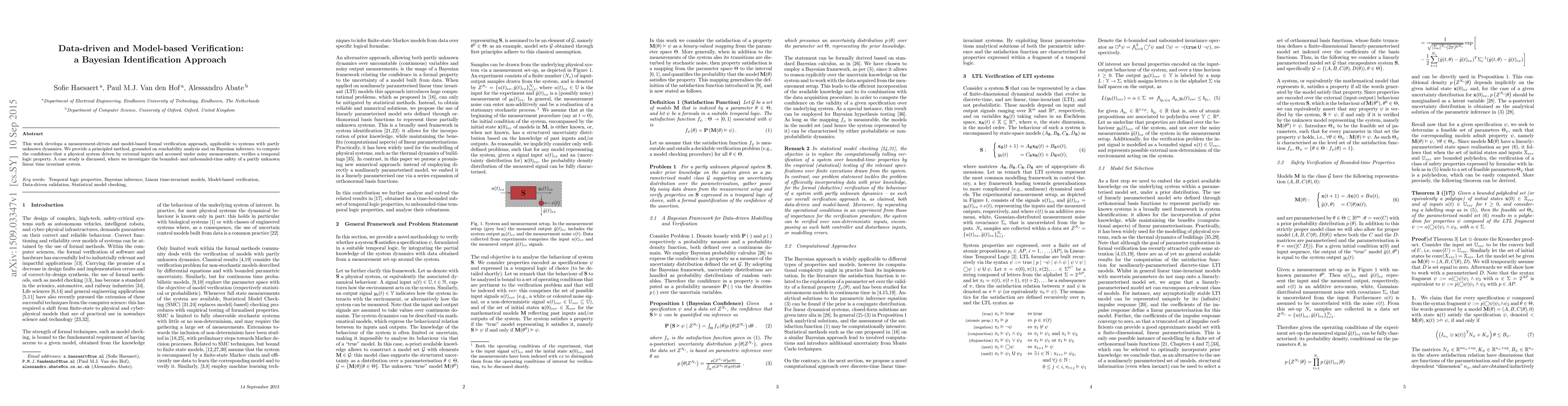 This work develops a measurement-driven and model-based formal verification approach, applicable to systems with partly unknown dynamics. We provide a principled method, grounded on reachability analysis and on Bayesian inference, to compute the confidence that a physical system driven by external inputs and accessed under noisy measurements, verifies a temporal logic property. A case study is discussed, where we investigate the bounded- and unbounded-time safety of a partly unknown linear time invariant system.