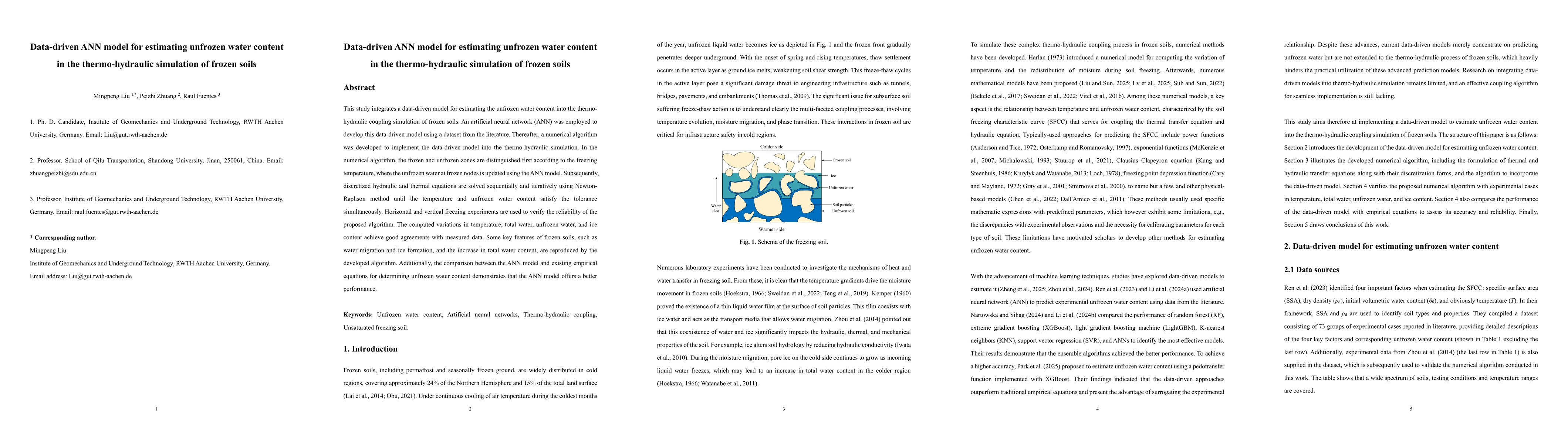 This research integrates an artificial neural network (ANN) model into thermo-hydraulic simulations of frozen soils to estimate unfrozen water content. The proposed algorithm, validated through experiments, demonstrates improved accuracy over existing empirical equations in capturing key features of frozen soils.