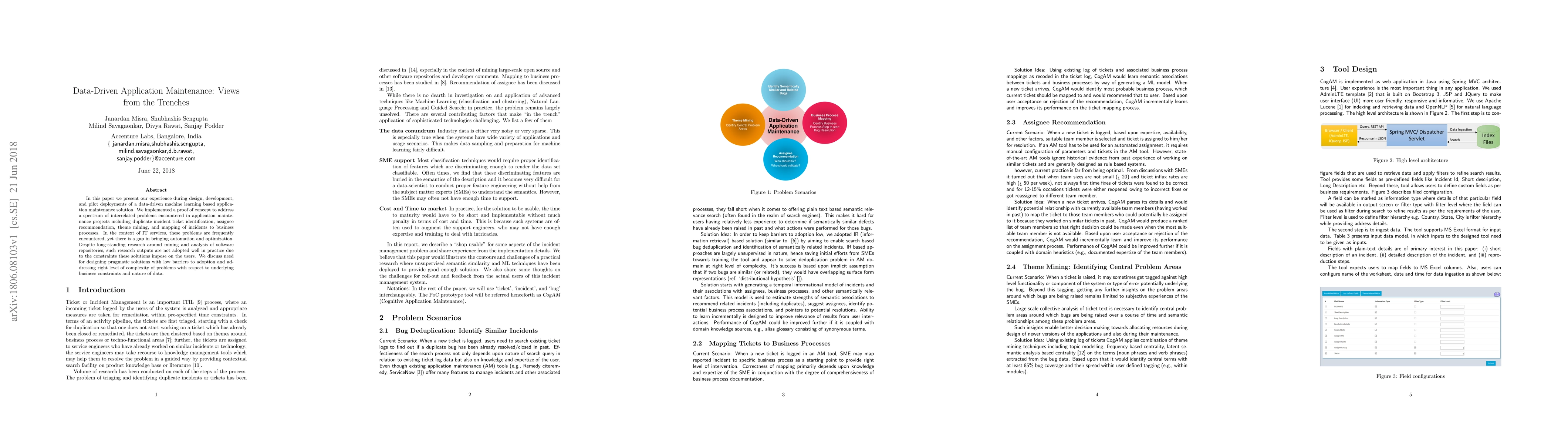 In this paper we present our experience during design, development, and pilot deployments of a data-driven machine learning based application maintenance solution. We implemented a proof of concept to address a spectrum of interrelated problems encountered in application maintenance projects including duplicate incident ticket identification, assignee recommendation, theme mining, and mapping of incidents to business processes. In the context of IT services, these problems are frequently encountered, yet there is a gap in bringing automation and optimization. Despite long-standing research around mining and analysis of software repositories, such research outputs are not adopted well in practice due to the constraints these solutions impose on the users. We discuss need for designing pragmatic solutions with low barriers to adoption and addressing right level of complexity of problems with respect to underlying business constraints and nature of data.