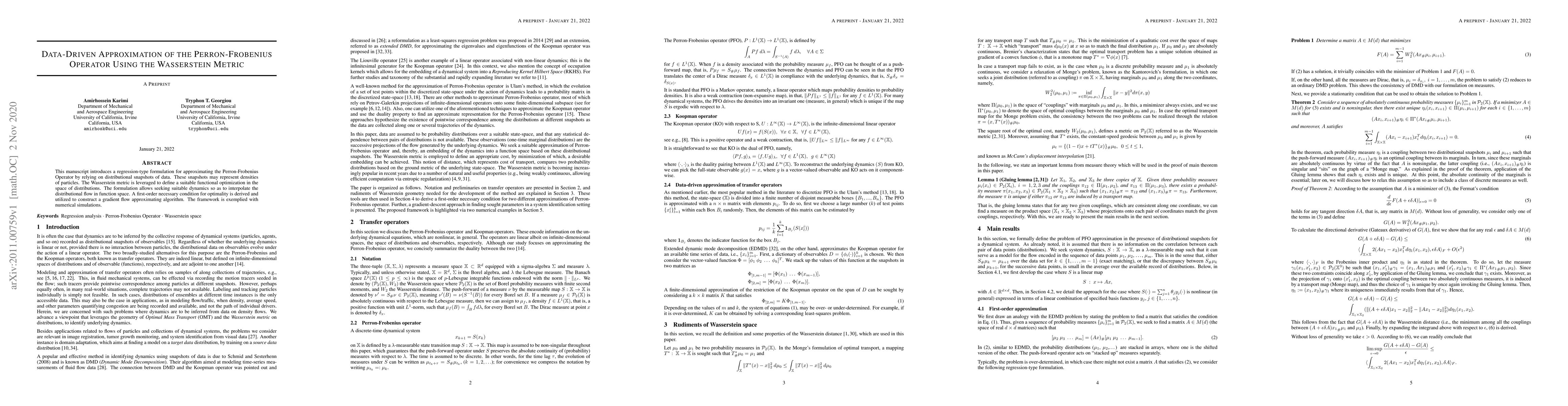 This paper proposes a regression-based approach to approximate the Perron-Frobenius Operator using data snapshots and the Wasserstein metric for functional optimization, and demonstrates its effectiveness through gradient flow algorithms and numerical simulations.