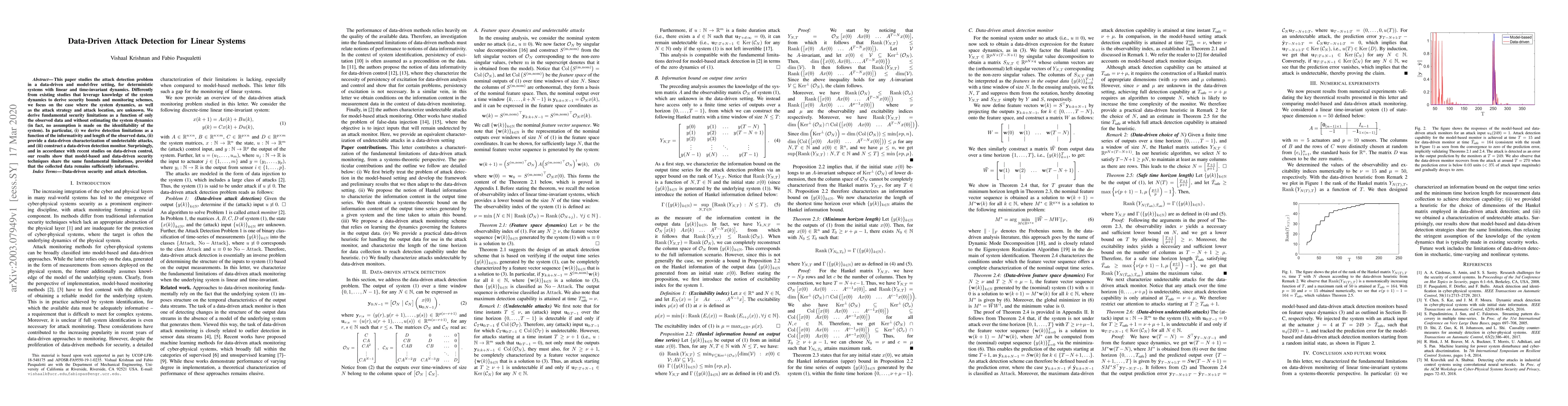 This paper studies the attack detection problem in a data-driven and model-free setting, for deterministic systems with linear and time-invariant dynamics. Differently from existing studies that leverage knowledge of the system dynamics to derive security bounds and monitoring schemes, we focus on the case where the system dynamics, as well as the attack strategy and attack location, are unknown. We derive fundamental security limitations as a function of only the observed data and without estimating the system dynamics (in fact, no assumption is made on the identifiability of the system). In particular, (i) we derive detection limitations as a function of the informativity and length of the observed data, (ii) provide a data-driven characterization of undetectable attacks, and (iii) construct a data-driven detection monitor. Surprisingly, and in accordance with recent studies on data-driven control, our results show that model-based and data-driven security techniques share the same fundamental limitations, provided that the collected data remains sufficiently informative.