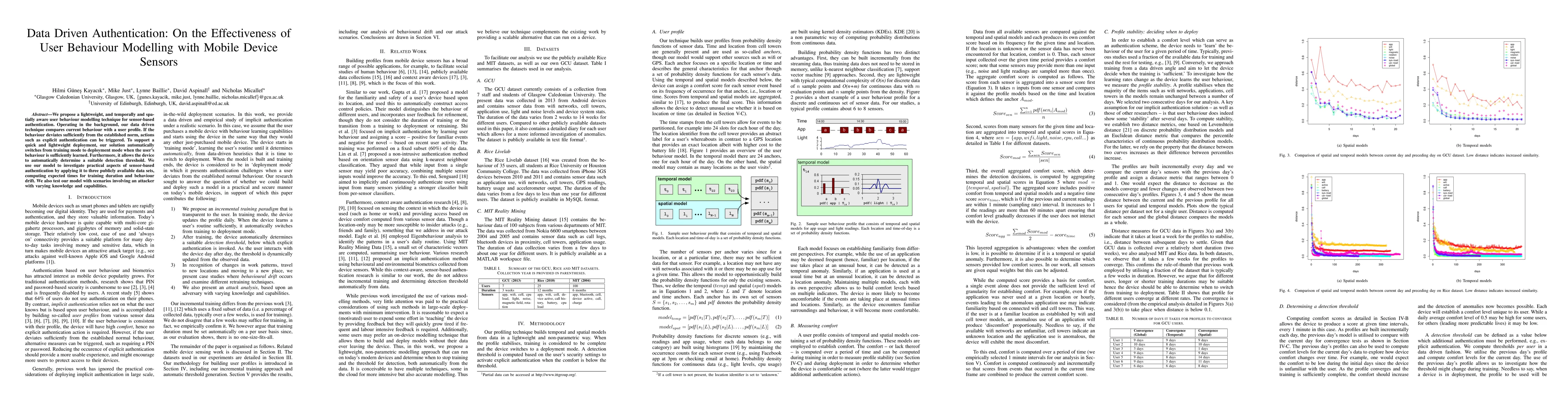 We propose a lightweight, and temporally and spatially aware user behaviour modelling technique for sensor-based authentication. Operating in the background, our data driven technique compares current behaviour with a user profile. If the behaviour deviates sufficiently from the established norm, actions such as explicit authentication can be triggered. To support a quick and lightweight deployment, our solution automatically switches from training mode to deployment mode when the user's behaviour is sufficiently learned. Furthermore, it allows the device to automatically determine a suitable detection threshold. We use our model to investigate practical aspects of sensor-based authentication by applying it to three publicly available data sets, computing expected times for training duration and behaviour drift. We also test our model with scenarios involving an attacker with varying knowledge and capabilities.