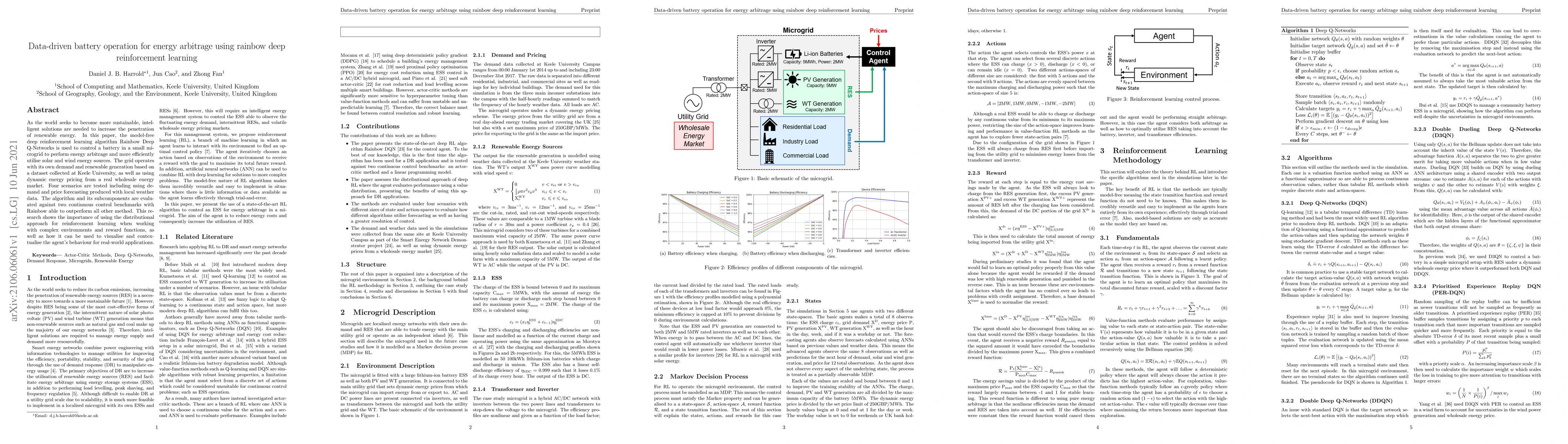 This paper employs Rainbow Deep Q-Networks for optimizing battery operation in a microgrid to perform energy arbitrage, leveraging solar and wind energy. The model-free reinforcement learning algorithm outperforms continuous control benchmarks, demonstrating the effectiveness of distributional reinforcement learning in complex environments.