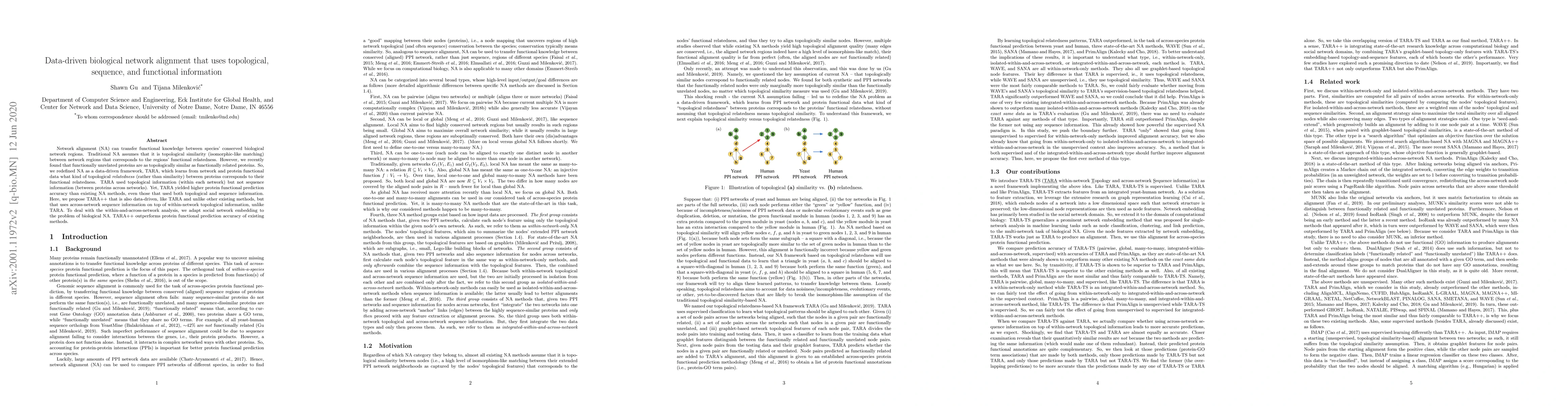 This paper proposes TARA++, a data-driven biological network alignment method that integrates topological, sequence, and functional information to improve protein functional prediction accuracy. Unlike previous methods, TARA++ uses both within-network topological and across-network sequence information, achieving superior performance over existing network alignment techniques.