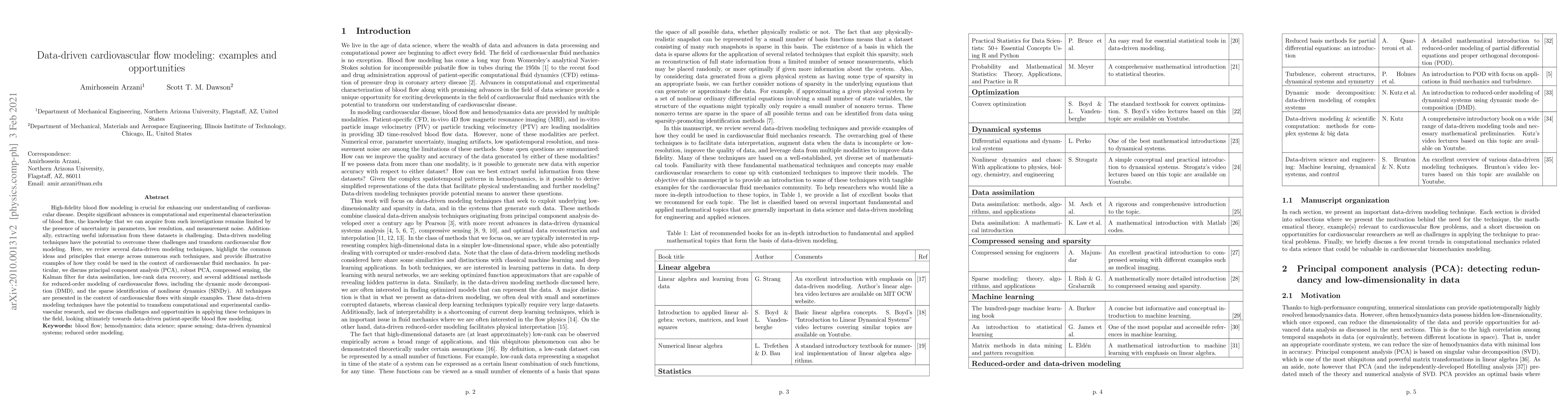 High-fidelity modeling of blood flow is crucial for enhancing our understanding of cardiovascular disease. Despite significant advances in computational and experimental characterization of blood flow, the knowledge that we can acquire from such investigations remains limited by the presence of uncertainty in parameters, low spatiotemporal resolution, and measurement noise. Additionally, extracting useful information from these datasets is challenging. Data-driven modeling techniques have the potential to overcome these challenges and transform cardiovascular flow modeling. In this paper, we review several data-driven modeling techniques, highlight the common ideas and principles that emerge across numerous such techniques, and provide illustrative examples of how they could be used in the context of cardiovascular fluid mechanics. In particular, we discuss principal component analysis (PCA), robust PCA, compressed sensing, the Kalman filter for data assimilation, low-rank data recovery, and several additional methods for reduced-order modeling for cardiovascular flows, including the dynamic mode decomposition (DMD), and the sparse identification of nonlinear dynamics (SINDy). All of these techniques are presented in the context of cardiovascular flows with simple examples. These data-driven modeling techniques have the potential to transform computational and experimental cardiovascular flow research, and we discuss challenges and opportunities in applying these techniques in the field, looking ultimately towards data-driven patient-specific blood flow modeling.