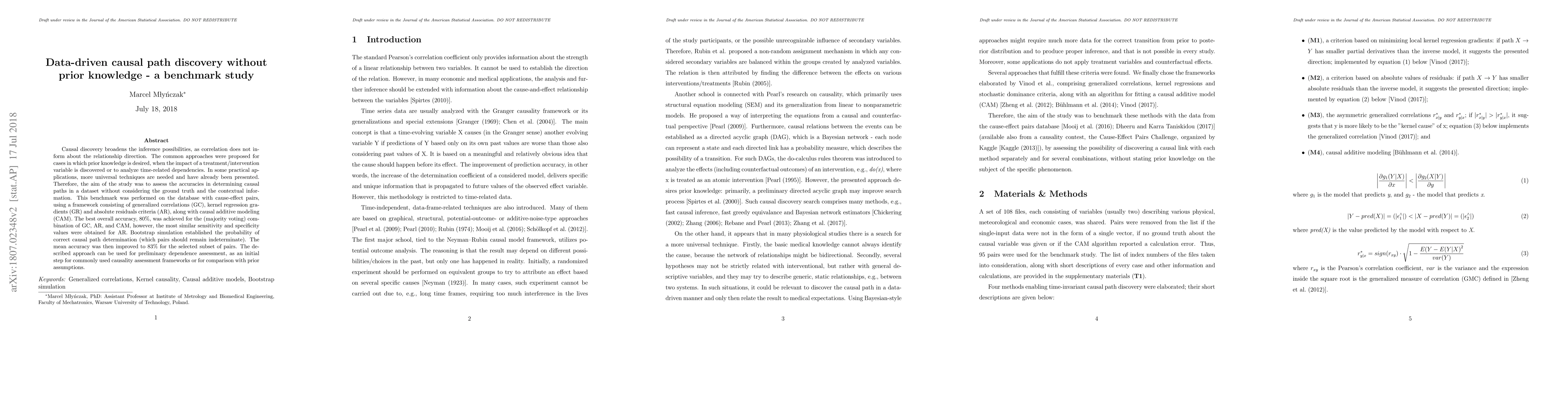 Causal discovery broadens the inference possibilities, as correlation does not inform about the relationship direction. The common approaches were proposed for cases in which prior knowledge is desired, when the impact of a treatment/intervention variable is discovered or to analyze time-related dependencies. In some practical applications, more universal techniques are needed and have already been presented. Therefore, the aim of the study was to assess the accuracies in determining causal paths in a dataset without considering the ground truth and the contextual information. This benchmark was performed on the database with cause-effect pairs, using a framework consisting of generalized correlations (GC), kernel regression gradients (GR) and absolute residuals criteria (AR), along with causal additive modeling (CAM). The best overall accuracy, 80%, was achieved for the (majority voting) combination of GC, AR, and CAM, however, the most similar sensitivity and specificity values were obtained for AR. Bootstrap simulation established the probability of correct causal path determination (which pairs should remain indeterminate). The mean accuracy was then improved to 83% for the selected subset of pairs. The described approach can be used for preliminary dependence assessment, as an initial step for commonly used causality assessment frameworks or for comparison with prior assumptions.