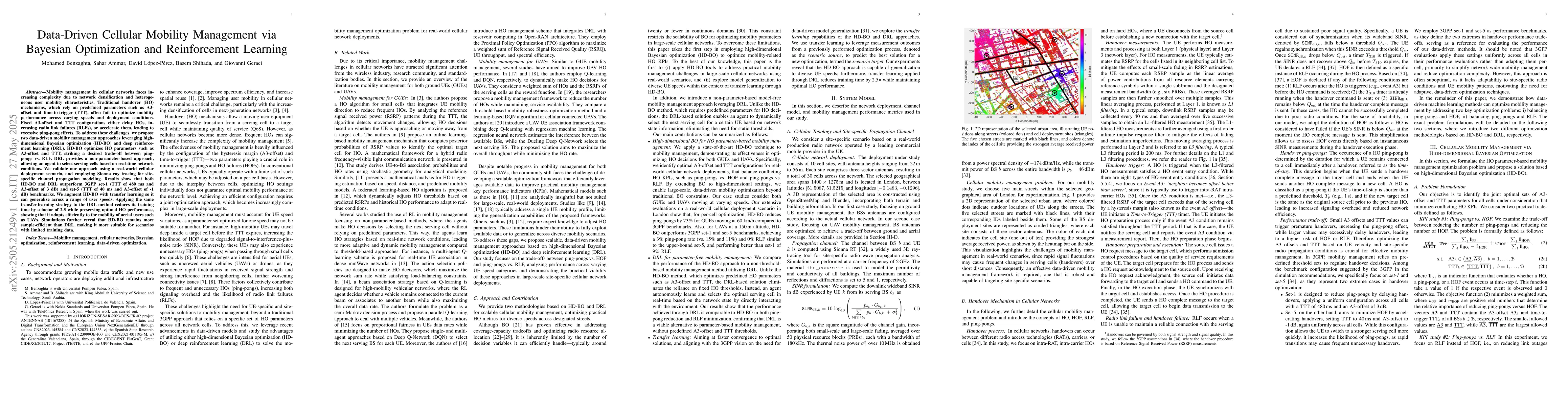 Mobility management in cellular networks faces increasing complexity due to network densification and heterogeneous user mobility characteristics. Traditional handover (HO) mechanisms, which rely on predefined parameters such as A3-offset and time-to-trigger (TTT), often fail to optimize mobility performance across varying speeds and deployment conditions. Fixed A3-offset and TTT configurations either delay HOs, increasing radio link failures (RLFs), or accelerate them, leading to excessive ping-pong effects. To address these challenges, we propose two data-driven mobility management approaches leveraging high-dimensional Bayesian optimization (HD-BO) and deep reinforcement learning (DRL). HD-BO optimizes HO parameters such as A3-offset and TTT, striking a desired trade-off between ping-pongs vs. RLF. DRL provides a non-parameter-based approach, allowing an agent to select serving cells based on real-time network conditions. We validate our approach using a real-world cellular deployment scenario, and employing Sionna ray tracing for site-specific channel propagation modeling. Results show that both HD-BO and DRL outperform 3GPP set-1 (TTT of 480 ms and A3-offset of 3 dB) and set-5 (TTT of 40 ms and A3-offset of -1 dB) benchmarks. We augment HD-BO with transfer learning so it can generalize across a range of user speeds. Applying the same transfer-learning strategy to the DRL method reduces its training time by a factor of 2.5 while preserving optimal HO performance, showing that it adapts efficiently to the mobility of aerial users such as UAVs. Simulations further reveal that HD-BO remains more sample-efficient than DRL, making it more suitable for scenarios with limited training data.