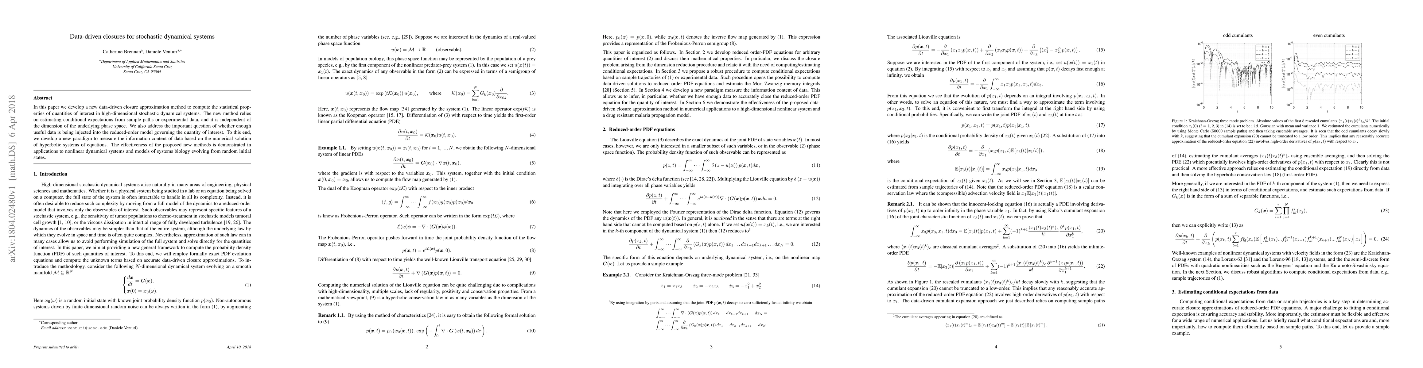 In this paper we develop a new data-driven closure approximation method to compute the statistical properties of quantities of interest in high-dimensional stochastic dynamical systems. The new method relies on estimating conditional expectations from sample paths or experimental data, and it is independent of the dimension of the underlying phase space. We also address the important question of whether enough useful data is being injected into the reduced-order model governing the quantity of interest. To this end, we develop a new paradigm to measure the information content of data based on the numerical solution of hyperbolic systems of equations. The effectiveness of the proposed new methods is demonstrated in applications to nonlinear dynamical systems and models of systems biology evolving from random initial states.