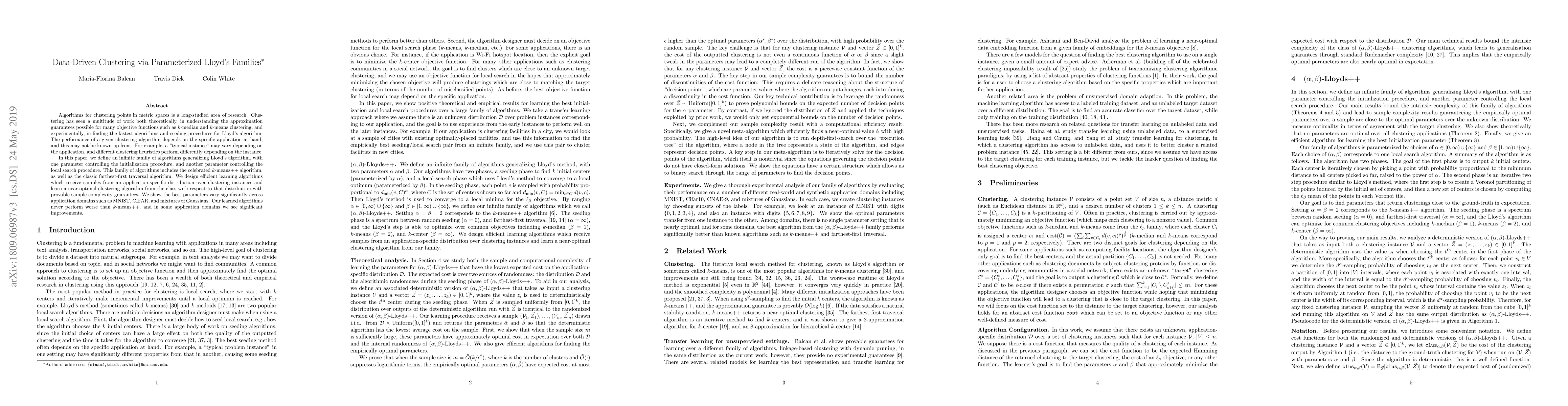 This paper introduces a family of parameterized algorithms generalizing Lloyd's algorithm, including k-means++ and farthest-first traversal. It presents efficient learning methods to adaptively select optimal parameters for clustering based on application-specific data distributions, demonstrating significant improvements over k-means++ on various datasets.
