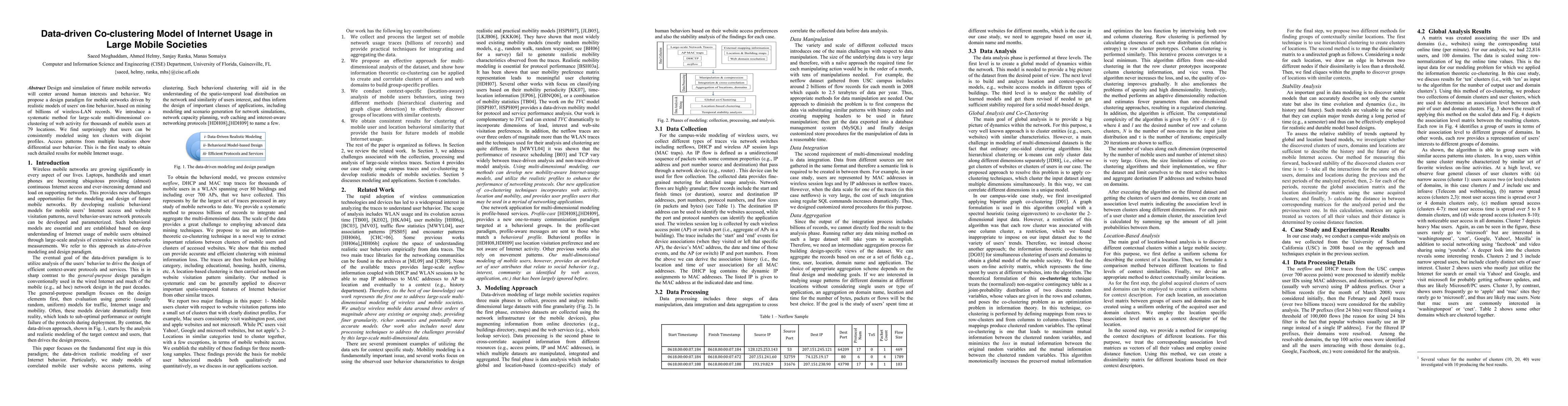 This paper proposes a data-driven co-clustering model to analyze and predict internet usage patterns in large mobile societies by mining wireless-LAN records. The study identifies ten distinct user clusters with unique behavior profiles, revealing differential usage patterns across multiple locations.