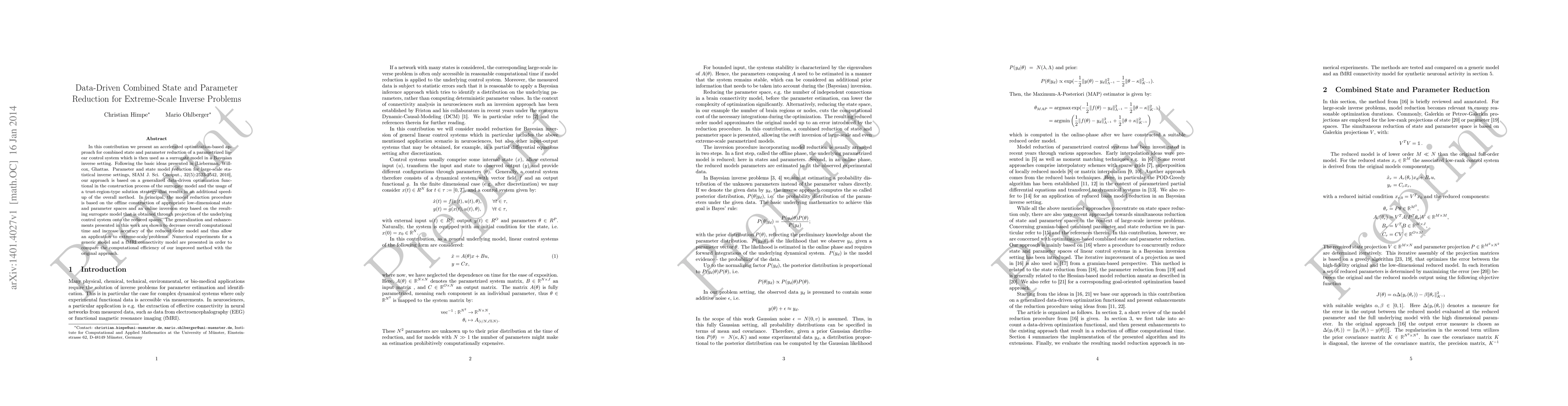 In this contribution we present an accelerated optimization-based approach for combined state and parameter reduction of a parametrized linear control system which is then used as a surrogate model in a Bayesian inverse setting. Following the basic ideas presented in [Lieberman, Willcox, Ghattas. Parameter and state model reduction for large-scale statistical inverse settings, SIAM J. Sci. Comput., 32(5):2523-2542, 2010], our approach is based on a generalized data-driven optimization functional in the construction process of the surrogate model and the usage of a trust-region-type solution strategy that results in an additional speed-up of the overall method. In principal, the model reduction procedure is based on the offline construction of appropriate low-dimensional state and parameter spaces and an online inversion step based on the resulting surrogate model that is obtained through projection of the underlying control system onto the reduced spaces. The generalization and enhancements presented in this work are shown to decrease overall computational time and increase accuracy of the reduced order model and thus allow an application to extreme-scale problems. Numerical experiments for a generic model and a fMRI connectivity model are presented in order to compare the computational efficiency of our improved method with the original approach.