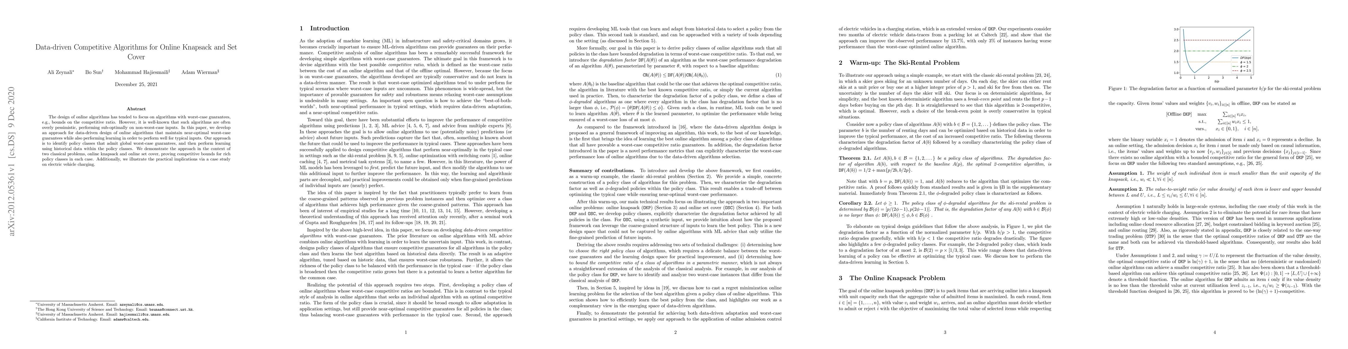 This paper proposes a data-driven method for designing online algorithms that achieve near-optimal worst-case guarantees while adapting to typical inputs through learning. It applies this approach to online knapsack and set cover problems, demonstrating competitive bounds and practical relevance via an electric vehicle charging case study.