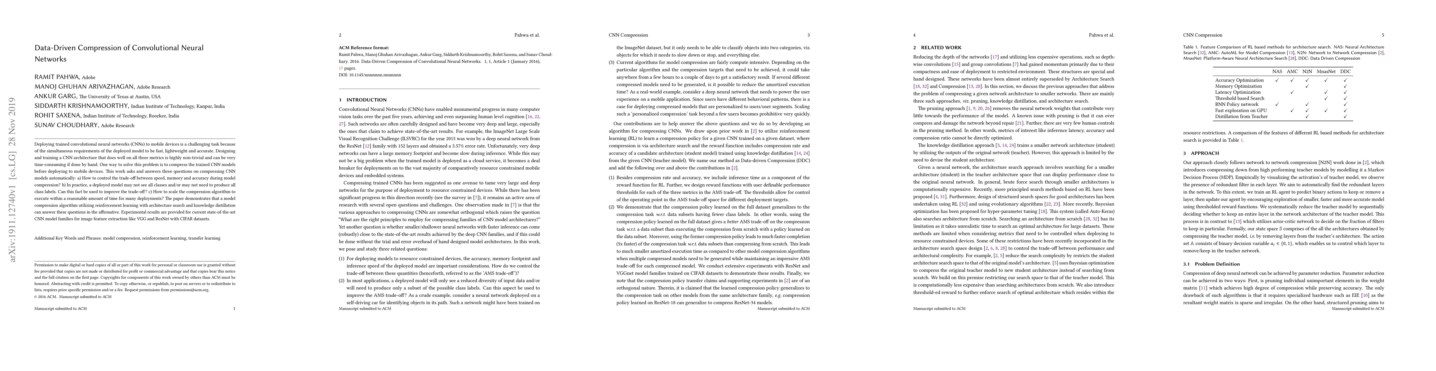 Deploying trained convolutional neural networks (CNNs) to mobile devices is a challenging task because of the simultaneous requirements of the deployed model to be fast, lightweight and accurate. Designing and training a CNN architecture that does well on all three metrics is highly non-trivial and can be very time-consuming if done by hand. One way to solve this problem is to compress the trained CNN models before deploying to mobile devices. This work asks and answers three questions on compressing CNN models automatically: a) How to control the trade-off between speed, memory and accuracy during model compression? b) In practice, a deployed model may not see all classes and/or may not need to produce all class labels. Can this fact be used to improve the trade-off? c) How to scale the compression algorithm to execute within a reasonable amount of time for many deployments? The paper demonstrates that a model compression algorithm utilizing reinforcement learning with architecture search and knowledge distillation can answer these questions in the affirmative. Experimental results are provided for current state-of-the-art CNN model families for image feature extraction like VGG and ResNet with CIFAR datasets.