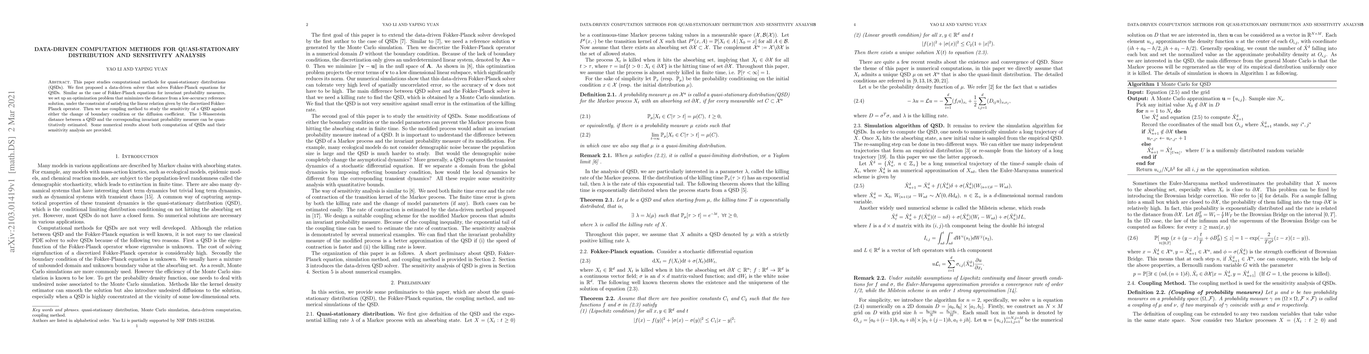 This paper studies computational methods for quasi-stationary distributions (QSDs). We first proposed a data-driven solver that solves Fokker-Planck equations for QSDs. Similar as the case of Fokker-Planck equations for invariant probability measures, we set up an optimization problem that minimizes the distance from a low-accuracy reference solution, under the constraint of satisfying the linear relation given by the discretized Fokker-Planck operator. Then we use coupling method to study the sensitivity of a QSD against either the change of boundary condition or the diffusion coefficient. The 1-Wasserstein distance between a QSD and the corresponding invariant probability measure can be quantitatively estimated. Some numerical results about both computation of QSDs and their sensitivity analysis are provided.