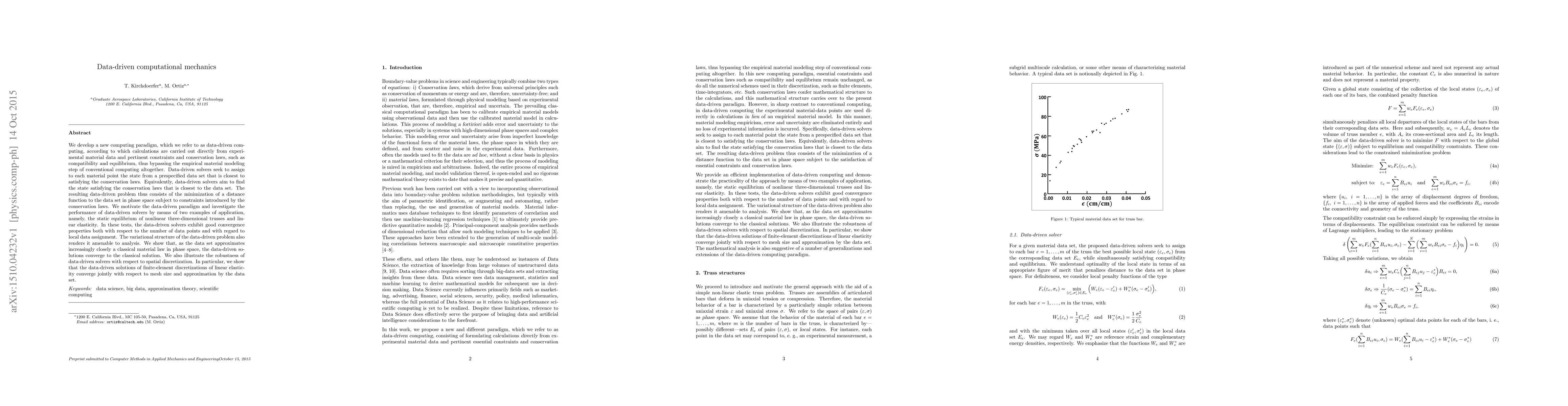 This paper introduces a novel data-driven computing paradigm that directly utilizes experimental material data and conservation laws to solve mechanical problems, bypassing traditional empirical modeling. The proposed data-driven solvers demonstrate good convergence and robustness, showing convergence to classical solutions as data approximates classical material laws.