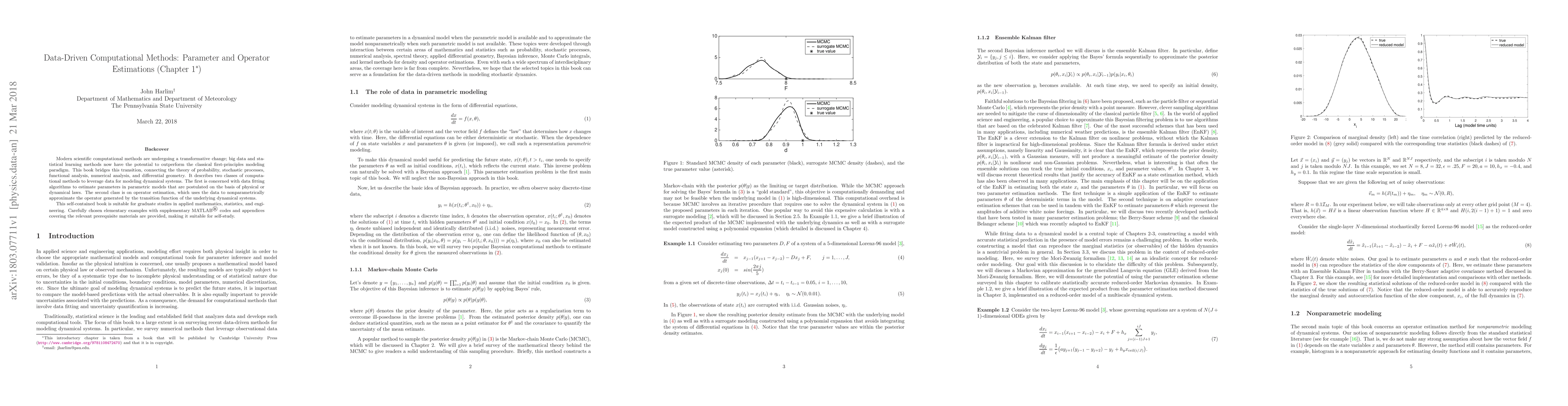 Modern scientific computational methods are undergoing a transformative change; big data and statistical learning methods now have the potential to outperform the classical first-principles modeling paradigm. This book bridges this transition, connecting the theory of probability, stochastic processes, functional analysis, numerical analysis, and differential geometry. It describes two classes of computational methods to leverage data for modeling dynamical systems. The first is concerned with data fitting algorithms to estimate parameters in parametric models that are postulated on the basis of physical or dynamical laws. The second class is on operator estimation, which uses the data to nonparametrically approximate the operator generated by the transition function of the underlying dynamical systems. This self-contained book is suitable for graduate studies in applied mathematics, statistics, and engineering. Carefully chosen elementary examples with supplementary MATLAB codes and appendices covering the relevant prerequisite materials are provided, making it suitable for self-study.