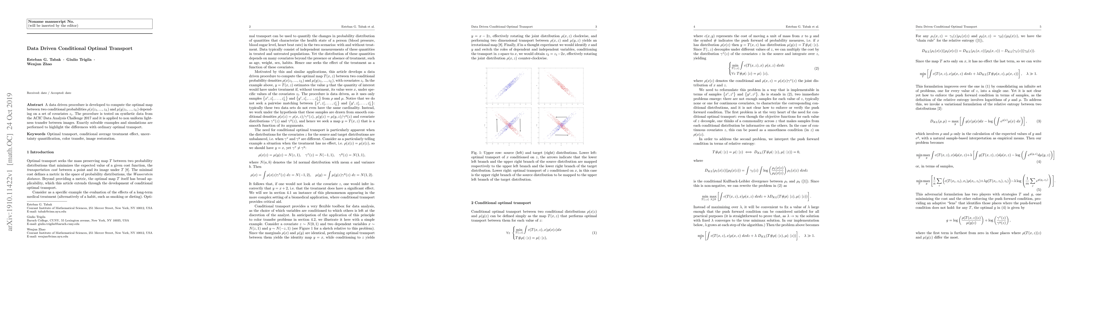 This paper introduces a data-driven method for computing optimal maps between conditional probability distributions based on covariates, tested on synthetic data and applied to non-uniform lightness transfer in images, contrasting it with traditional optimal transport.