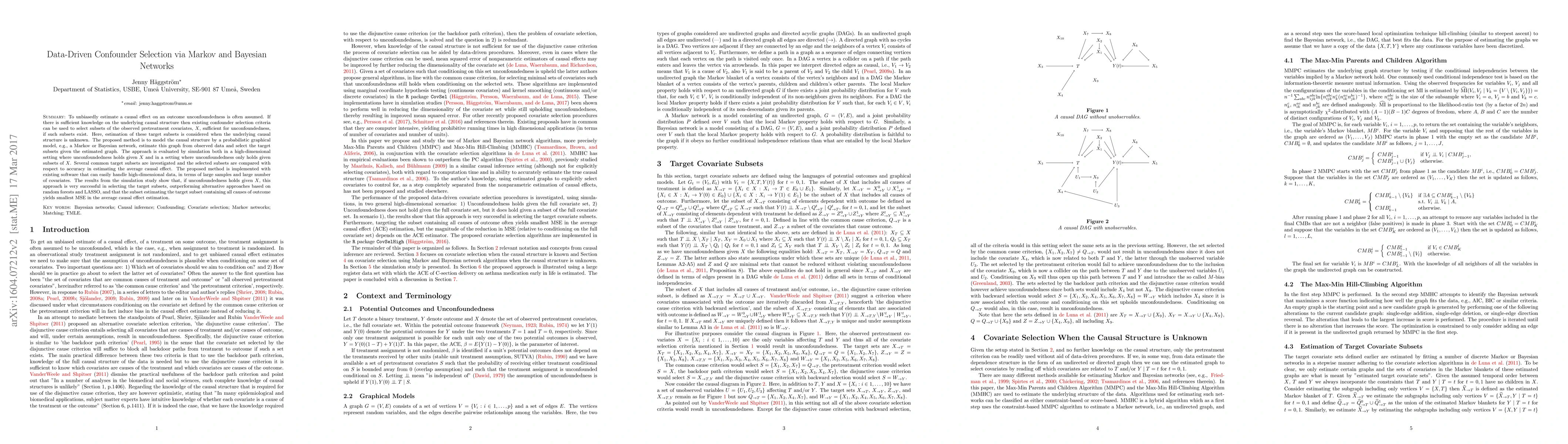 This paper proposes a method for selecting confounder subsets using Markov and Bayesian networks to estimate causal effects when the underlying causal structure is unknown. The method estimates the causal graph from data and selects subsets that ensure unconfoundedness, outperforming alternative methods in simulations, especially when unconfoundedness holds for the full set of covariates.