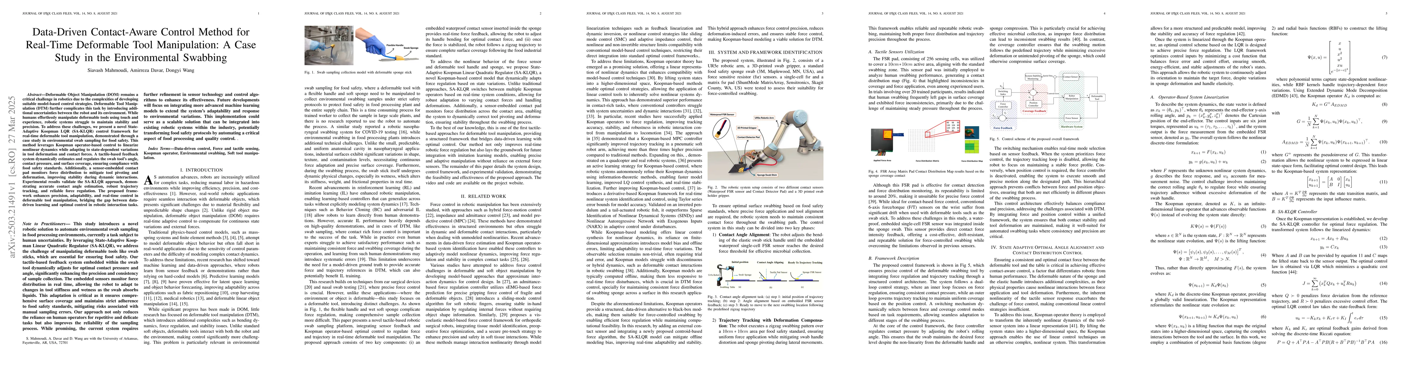 The research presents a data-driven contact-aware control method using a State-Adaptive Koopman LQR (SA-KLQR) framework for real-time deformable tool manipulation, demonstrated through a case study in environmental swab sampling for food safety.