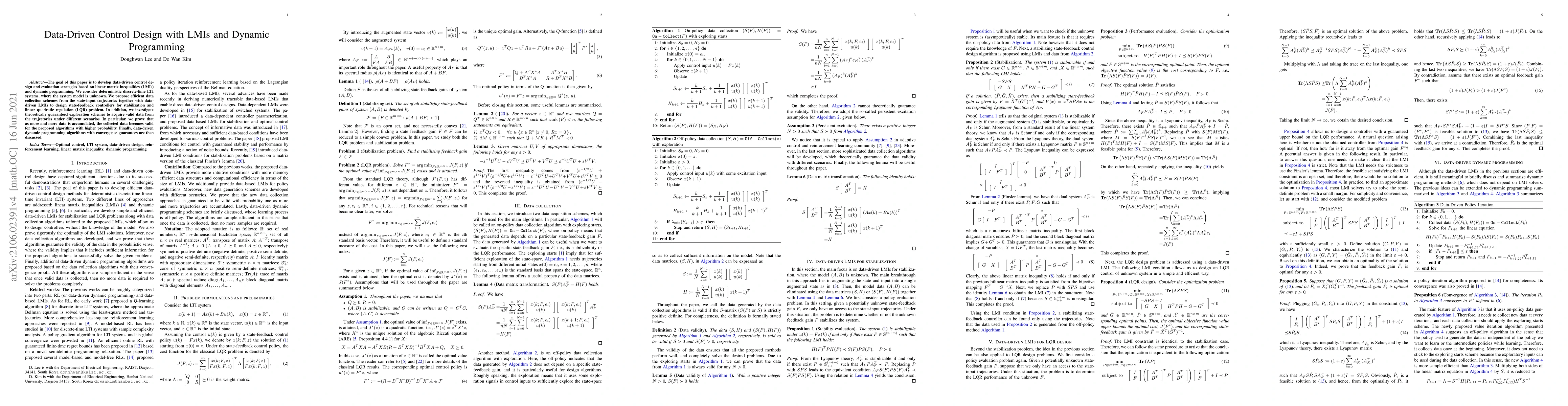 This paper proposes data-driven control design strategies for unknown deterministic discrete-time LTI systems using LMIs and dynamic programming, including efficient data collection schemes and theoretically guaranteed exploration methods to ensure data validity. It also discusses dynamic programming algorithms with convergence guarantees.