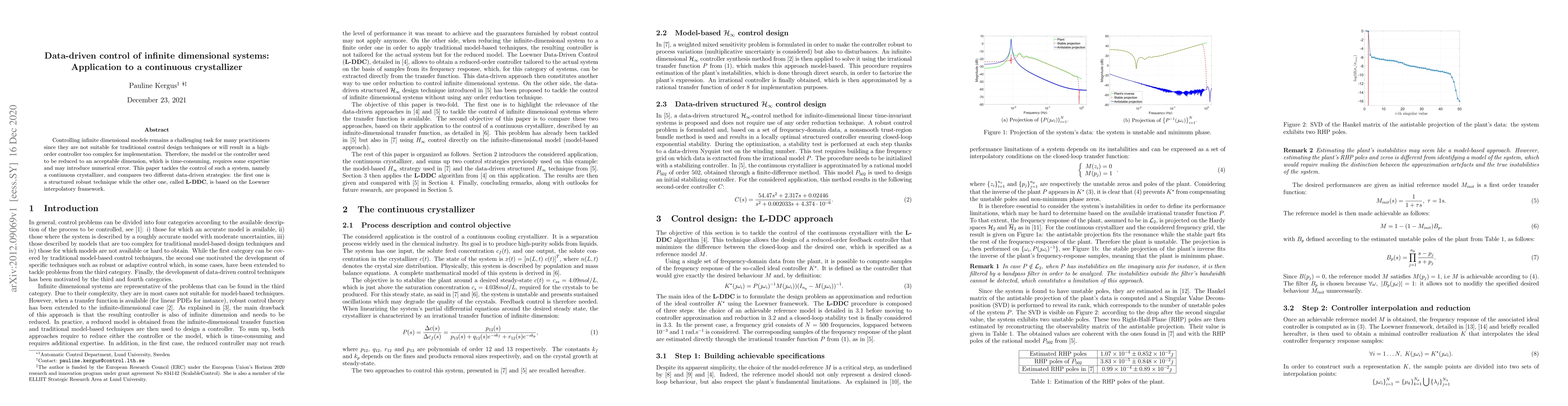 Controlling infinite dimensional models remains a challenging task for many practitioners since they are not suitable for traditional control design techniques or will result in a high-order controller too complex for implementation. Therefore, the model or the controller need to be reduced to an acceptable dimension, which is time-consuming, requires some expertise and may introduce numerical error. This paper tackles the control of such a system, namely a continuous crystallizer, and compares two different data-driven strategies: the first one is a structured robust technique while the other one, called L-DDC, is based on the Loewner interpolatory framework.