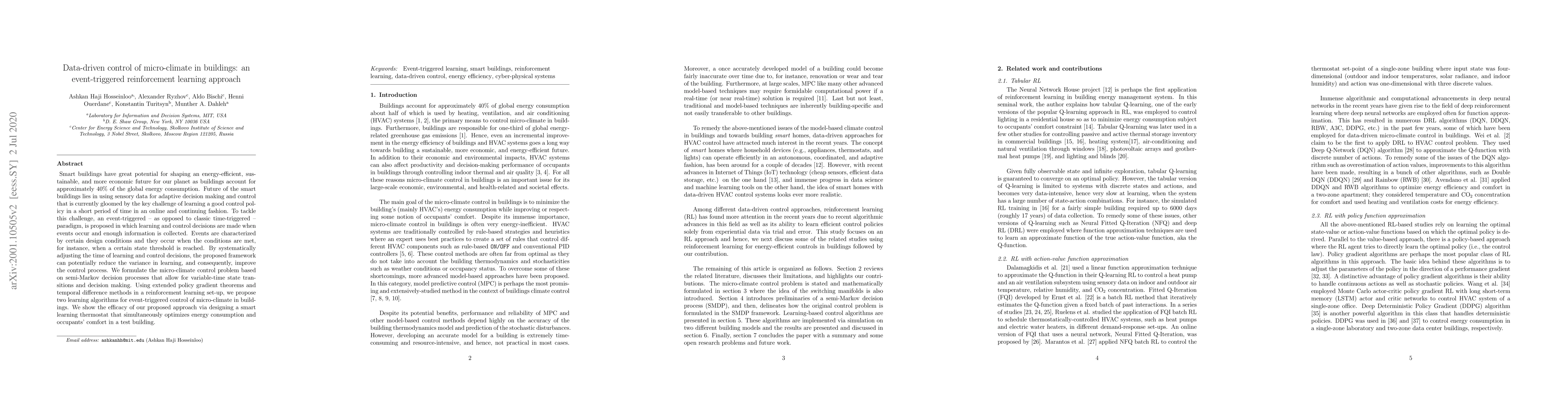 This paper proposes an event-triggered reinforcement learning approach for adaptive micro-climate control in smart buildings, aiming to optimize energy efficiency and occupant comfort. The method reduces the frequency of learning and control decisions, thereby minimizing variance and improving the control process.