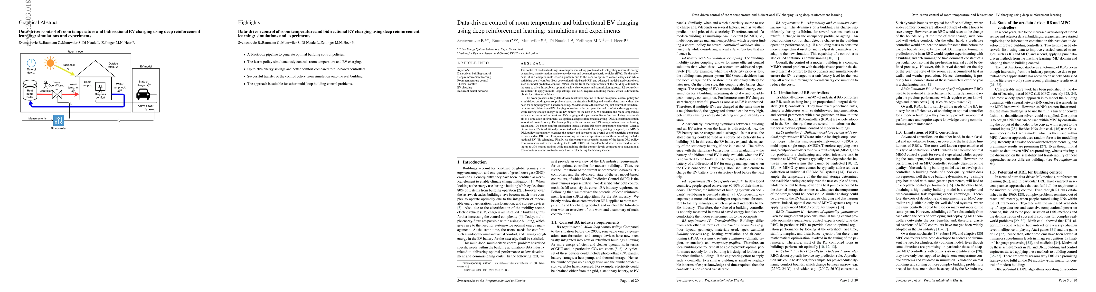 This paper proposes a data-driven, deep reinforcement learning approach to optimize room temperature control and bidirectional EV charging, achieving significant energy savings and comfort satisfaction. The method successfully transfers from simulation to real-world application, demonstrating up to 30% energy savings in a Swiss building.