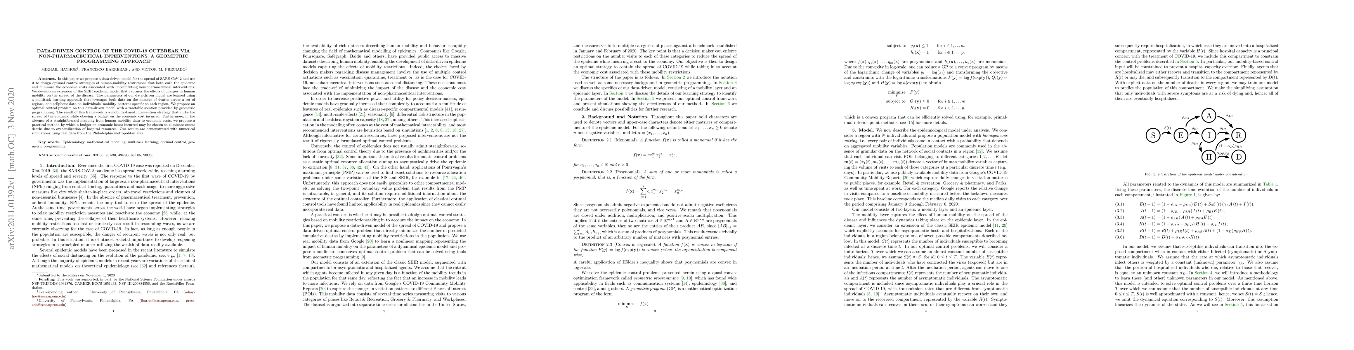 In this paper we propose a data-driven model for the spread of SARS-CoV-2 and use it to design optimal control strategies of human-mobility restrictions that both curb the epidemic and minimize the economic costs associated with implementing non-pharmaceutical interventions. We develop an extension of the SEIR epidemic model that captures the effects of changes in human mobility on the spread of the disease. The parameters of our data-driven model are learned using a multitask learning approach that leverages both data on the number of deaths across a set of regions, and cellphone data on individuals' mobility patterns specific to each region. We propose an optimal control problem on this data-driven model with a tractable solution provided by geometric programming. The result of this framework is a mobility-based intervention strategy that curbs the spread of the epidemic while obeying a budget on the economic cost incurred. Furthermore, in the absence of a straightforward mapping from human mobility data to economic costs, we propose a practical method by which a budget on economic losses incurred may be chosen to eliminate excess deaths due to over-utilization of hospital resources. Our results are demonstrated with numerical simulations using real data from the Philadelphia metropolitan area.