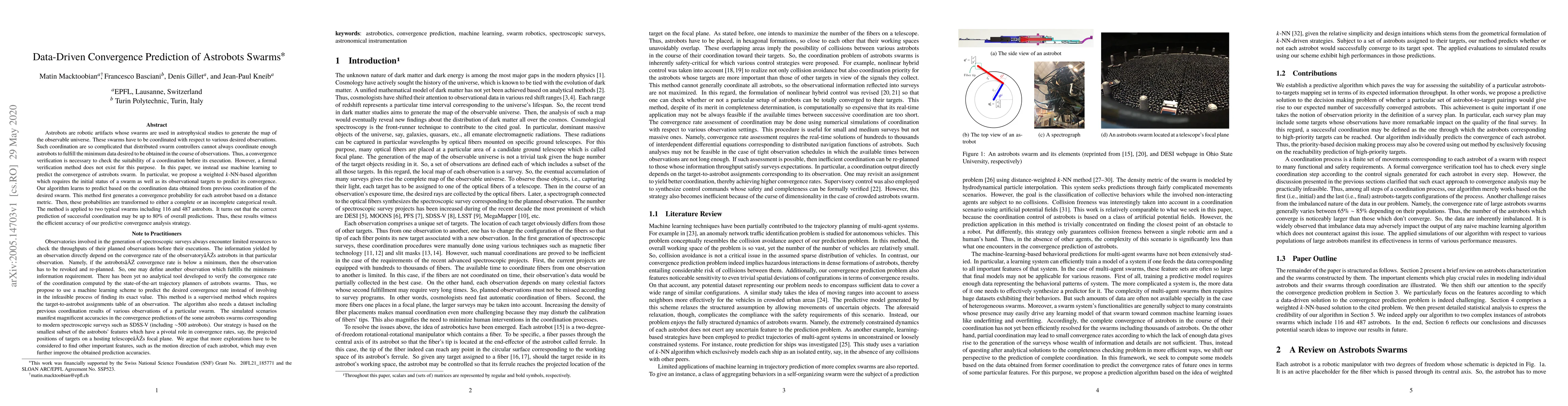 Astrobots are robotic artifacts whose swarms are used in astrophysical studies to generate the map of the observable universe. These swarms have to be coordinated with respect to various desired observations. Such coordination are so complicated that distributed swarm controllers cannot always coordinate enough astrobots to fulfill the minimum data desired to be obtained in the course of observations. Thus, a convergence verification is necessary to check the suitability of a coordination before its execution. However, a formal verification method does not exist for this purpose. In this paper, we instead use machine learning to predict the convergence of astrobots swarm. In particular, we propose a weighted $k$-NN-based algorithm which requires the initial status of a swarm as well as its observational targets to predict its convergence. Our algorithm learns to predict based on the coordination data obtained from previous coordination of the desired swarm. This method first generates a convergence probability for each astrobot based on a distance metric. Then, these probabilities are transformed to either a complete or an incomplete categorical result. The method is applied to two typical swarms including 116 and 487 astrobots. It turns out that the correct prediction of successful coordination may be up to 80% of overall predictions. Thus, these results witness the efficient accuracy of our predictive convergence analysis strategy.