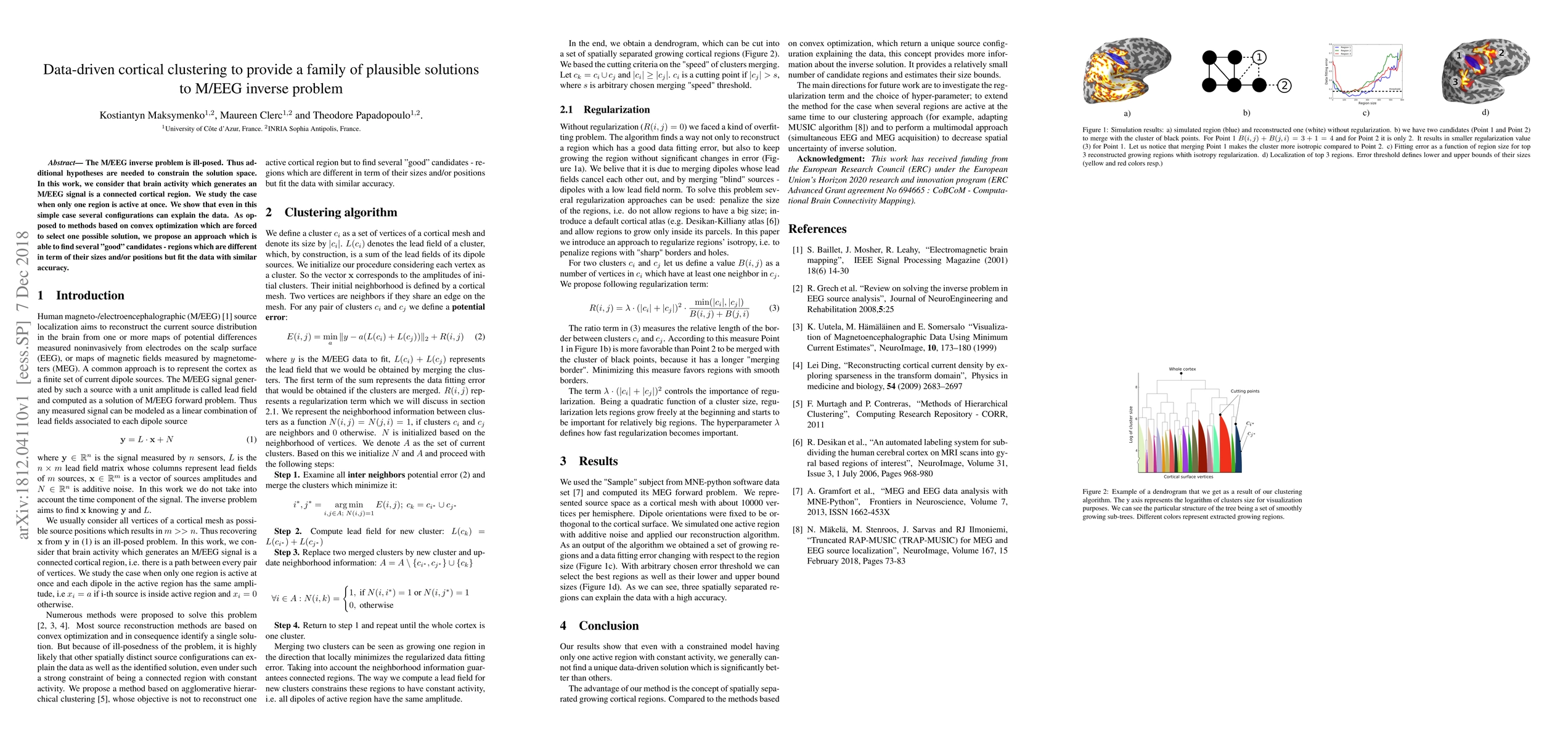 The M/EEG inverse problem is ill-posed. Thus additional hypotheses are needed to constrain the solution space. In this work, we consider that brain activity which generates an M/EEG signal is a connected cortical region. We study the case when only one region is active at once. We show that even in this simple case several configurations can explain the data. As opposed to methods based on convex optimization which are forced to select one possible solution, we propose an approach which is able to find several "good" candidates - regions which are different in term of their sizes and/or positions but fit the data with similar accuracy.