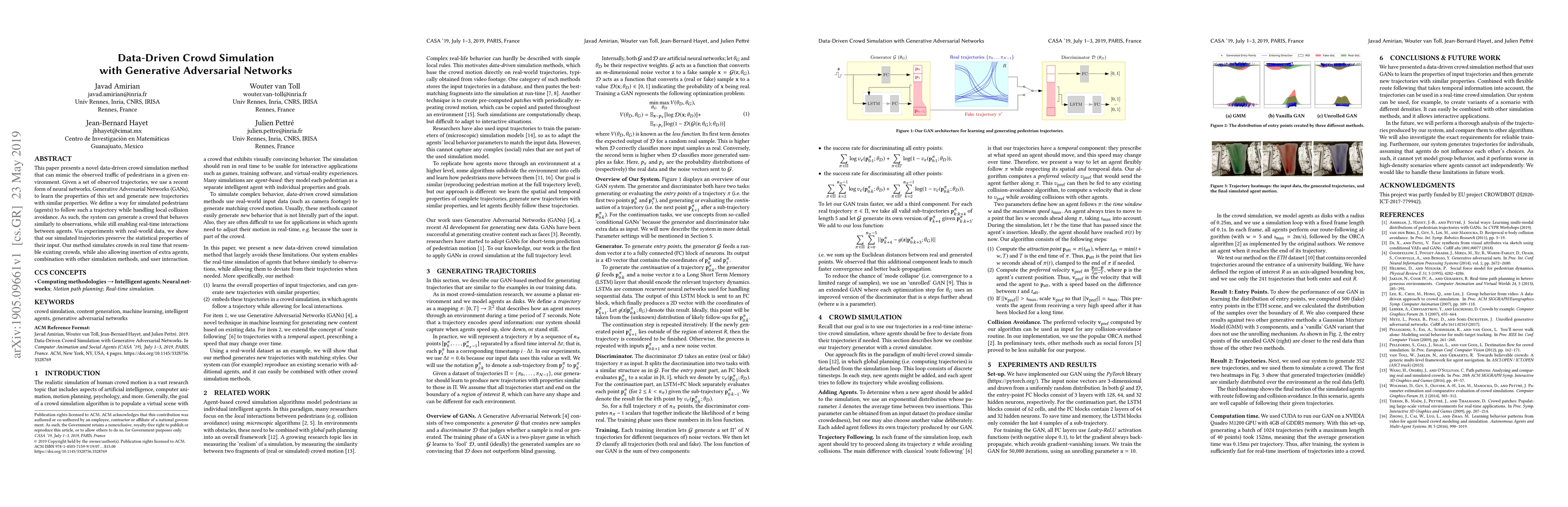 This paper introduces a crowd simulation method using Generative Adversarial Networks (GANs) to mimic pedestrian traffic from observed trajectories, enabling real-time interactions and local collision avoidance. Experiments demonstrate that the generated trajectories maintain statistical properties of the input data.