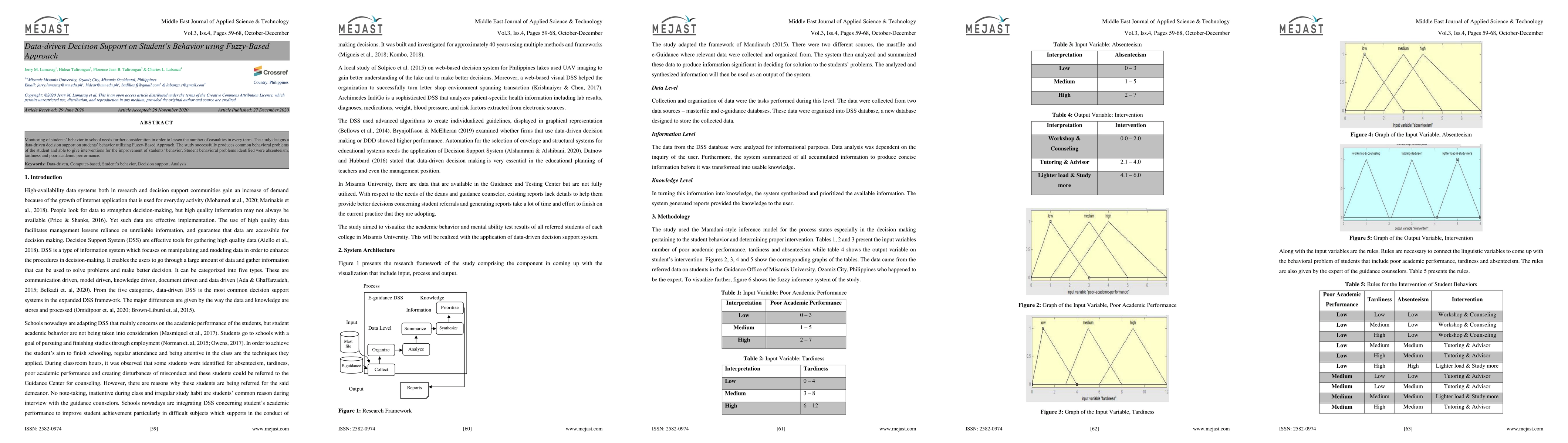 Summary: This study develops a data-driven decision support system using a Fuzzy Based Approach to monitor student behavior and reduce casualties. It identifies common issues like absenteeism, tardiness, and poor academic performance, and provides interventions for behavioral improvement.